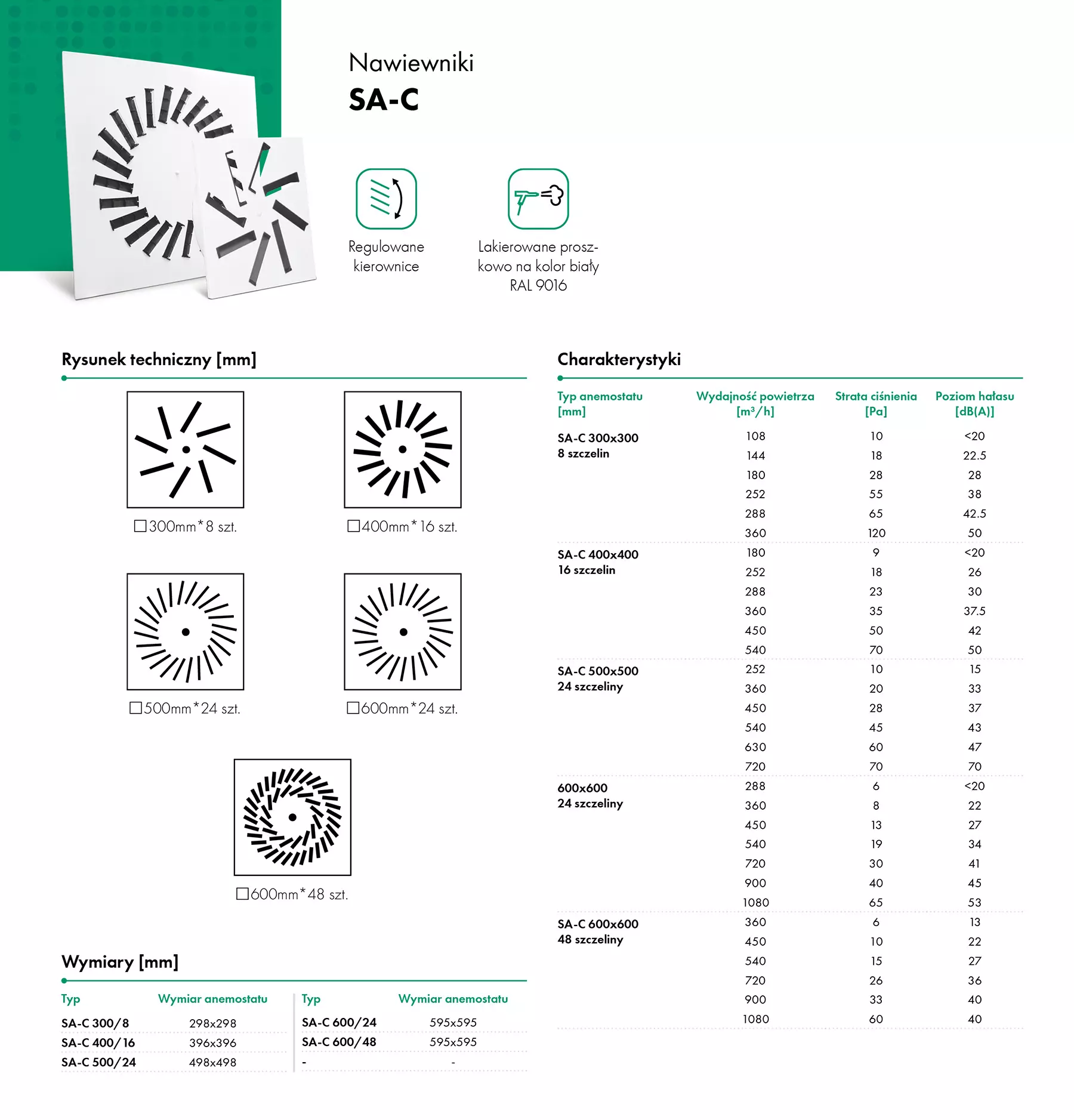 - Nastawne Kierownice: Wyposażony w nastawne plastikowe kierownice (ilość kierownic w zależności od typu, od 8 do 48), które umożliwiają precyzyjne dostosowanie kierunku przepływu powietrza, zapewniając elastyczność w sterowaniu strumieniem.