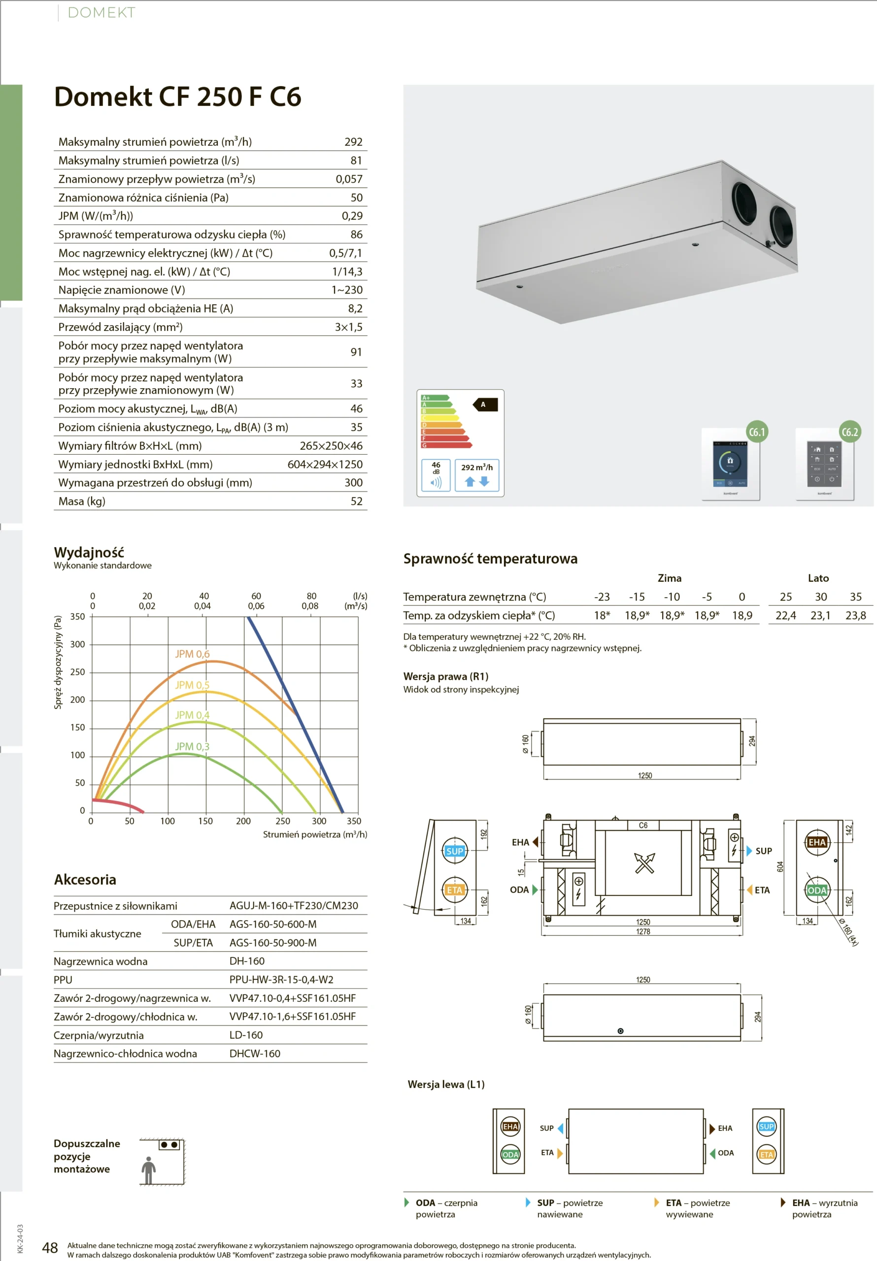DOMEKT CF 250 F wyróżnia się wysoką efektywnością energetyczną, co potwierdza przyznana mu klasa A. Niski pobór mocy przez wentylatory (91 W przy przepływie maksymalnym) oraz sprawność odzysku ciepła na poziomie 86% sprawiają, że urządzenie znacząco redukuje koszty eksploatacyjne. Dzięki temu inwestycja w tę centralę zwraca się w krótkim czasie, a użytkownicy mogą cieszyć się komfortem przy jednoczesnym obniżeniu rachunków za energię.