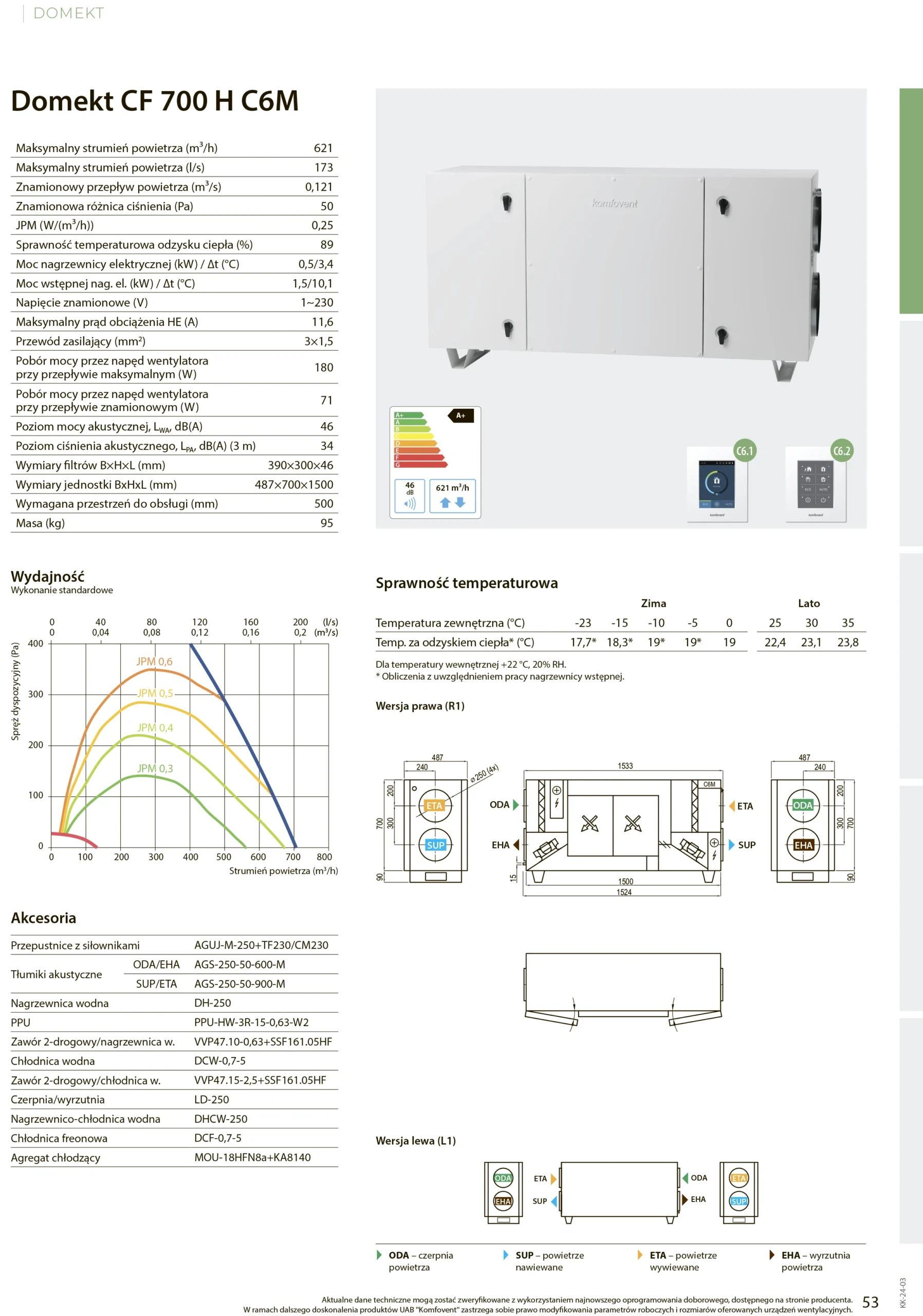DOMEKT CF 700 H charakteryzuje się wysoką efektywnością energetyczną, co przekłada się na oszczędności w kosztach eksploatacyjnych. Niskie zużycie energii przy maksymalnym przepływie powietrza (180 W) oraz efektywny odzysk ciepła (89%) sprawiają, że jest to urządzenie, które szybko zwróci się w inwestycji.