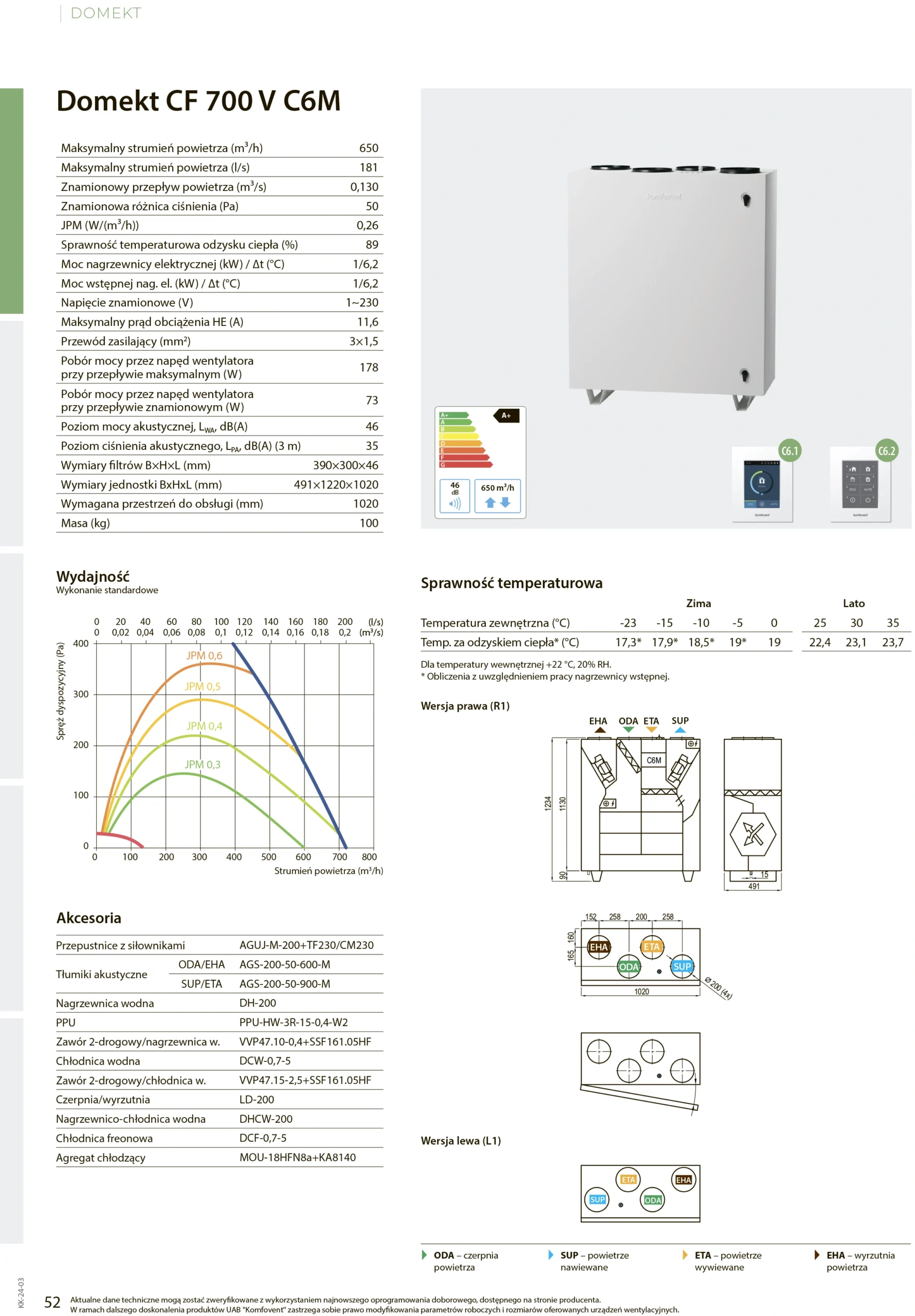 DOMEKT CF 700 V wyróżnia się wysoką efektywnością energetyczną, co potwierdza przyznana jej klasa A+. Niski pobór energii przez wentylatory oraz wysoka sprawność odzysku ciepła pozwalają na znaczące oszczędności w kosztach ogrzewania i klimatyzacji. Dzięki temu użytkownicy mogą cieszyć się świeżym powietrzem w swoich wnętrzach bez obaw o wysokie rachunki za energię.
