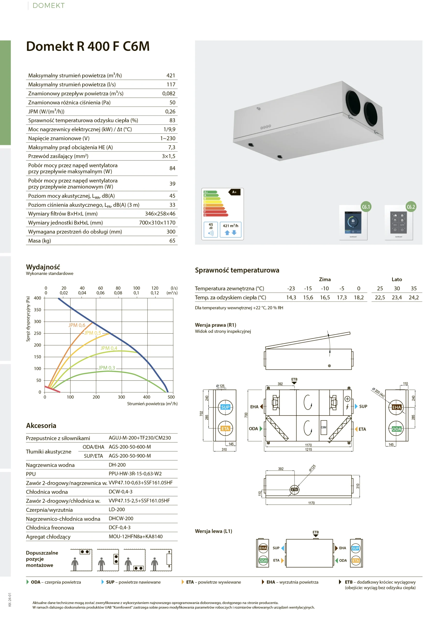 - Wyjątkowo energooszczędny – brak nagrzewnicy wstępnej, bardzo niski współczynnik JPM – 0,26 (W/m3/h), klasa energetyczna A+
