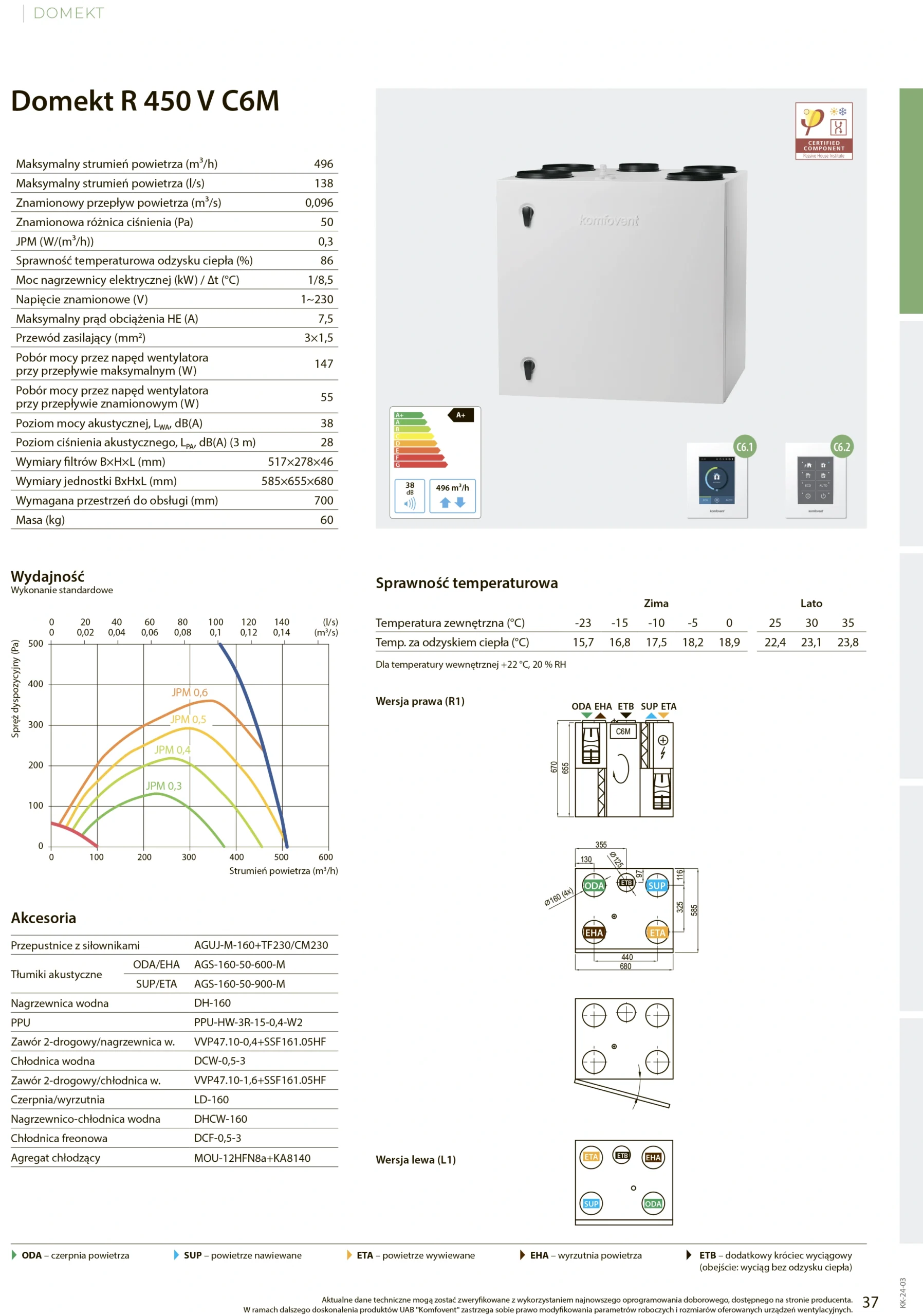 - Wyjątkowo energooszczędny – brak nagrzewnicy wstępnej, bardzo niski współczynnik JPM – 0,3 (W/m3/h), klasa energetyczna A+