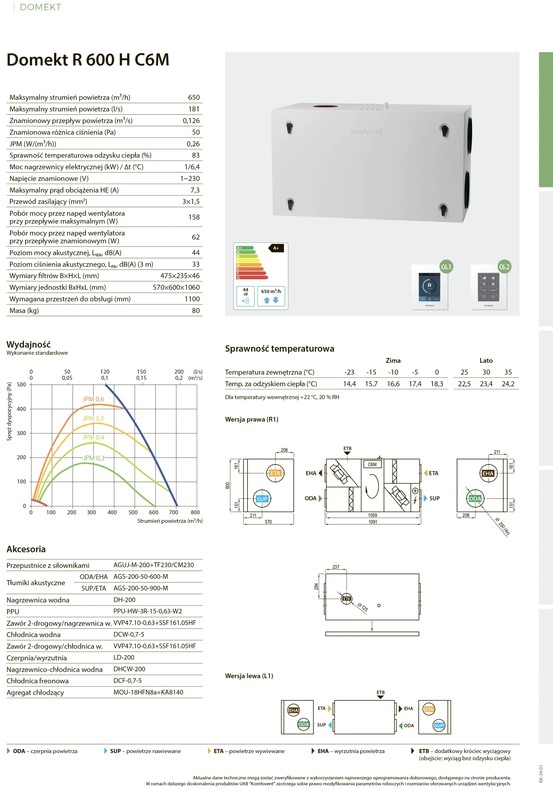 - Wyjątkowo energooszczędny – brak nagrzewnicy wstępnej, bardzo niski współczynnik JPM – 0,26 (W/m3/h), klasa energetyczna A+