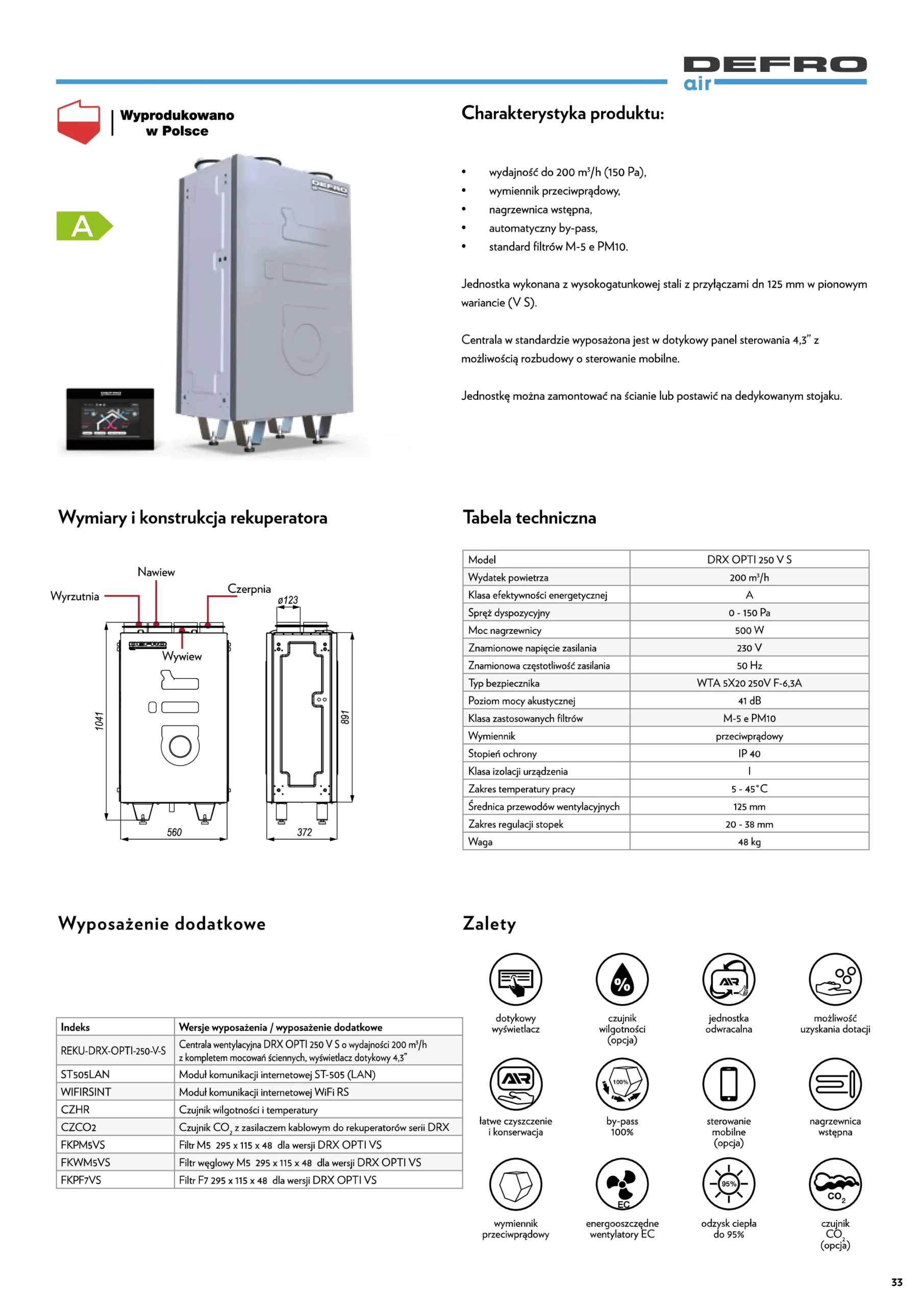 100% by-pass: Funkcja 100% by-passu umożliwia dostarczanie świeżego i chłodnego powietrza w okresie letnim, zwiększając komfort termiczny w pomieszczeniach.