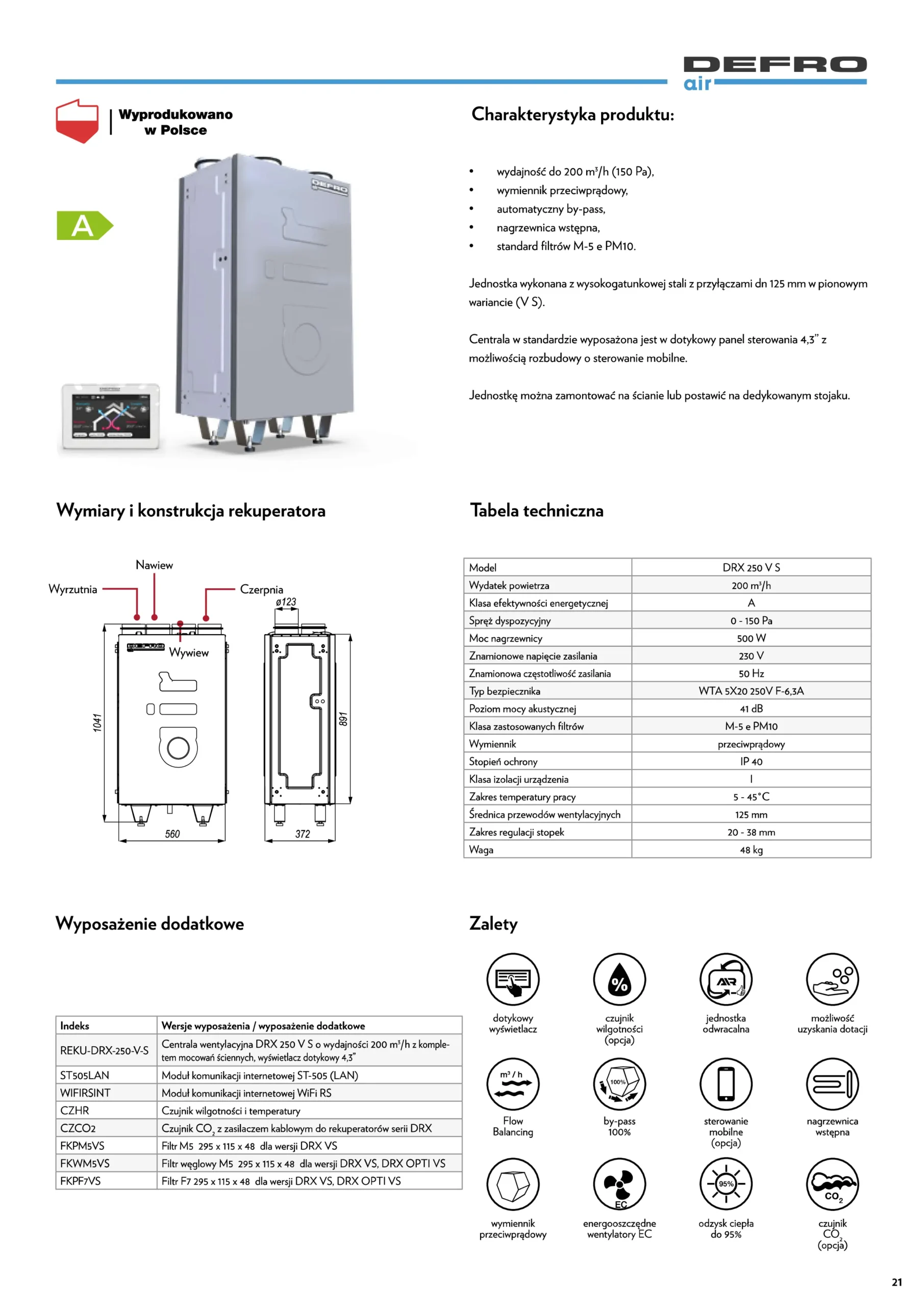 Centrala DRX V S wyróżnia się nowoczesnym designem i jednostką odwracalną, co daje elastyczność w wyborze sposobu montażu – stojący, ścienny, podwieszany. Uchwyt do montażu ściennego w zestawie ułatwia instalację, a system antyzamrożeniowy z nagrzewnicą wstępną zapewnia bezpieczną eksploatację w trudniejszych warunkach atmosferycznych.