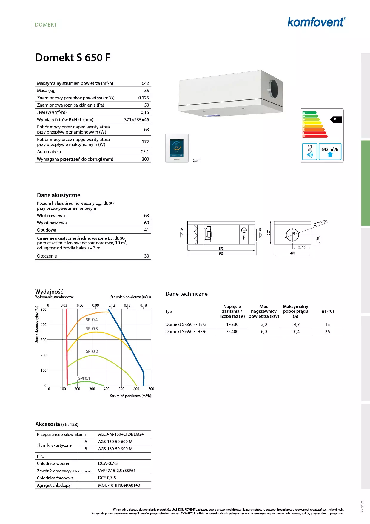 - Klasa energetyczna – B, pobór mocy przez napęd wentylatora przy przepływie maksymalnym – 172W.