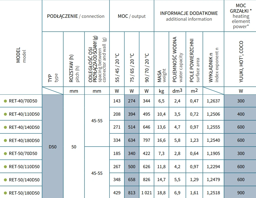 Grzejnik ten stanowi nie tylko źródło ciepła, ale również efektowny element dekoracyjny. Jego wykończenie jest niezwykle trwałe, odporne na wilgoć i łatwe w utrzymaniu czystości. Dzięki szerokiej gamie dostępnych kolorów, RETTO D50 można idealnie dopasować do wystroju każdej łazienki – od klasycznej po loftową.