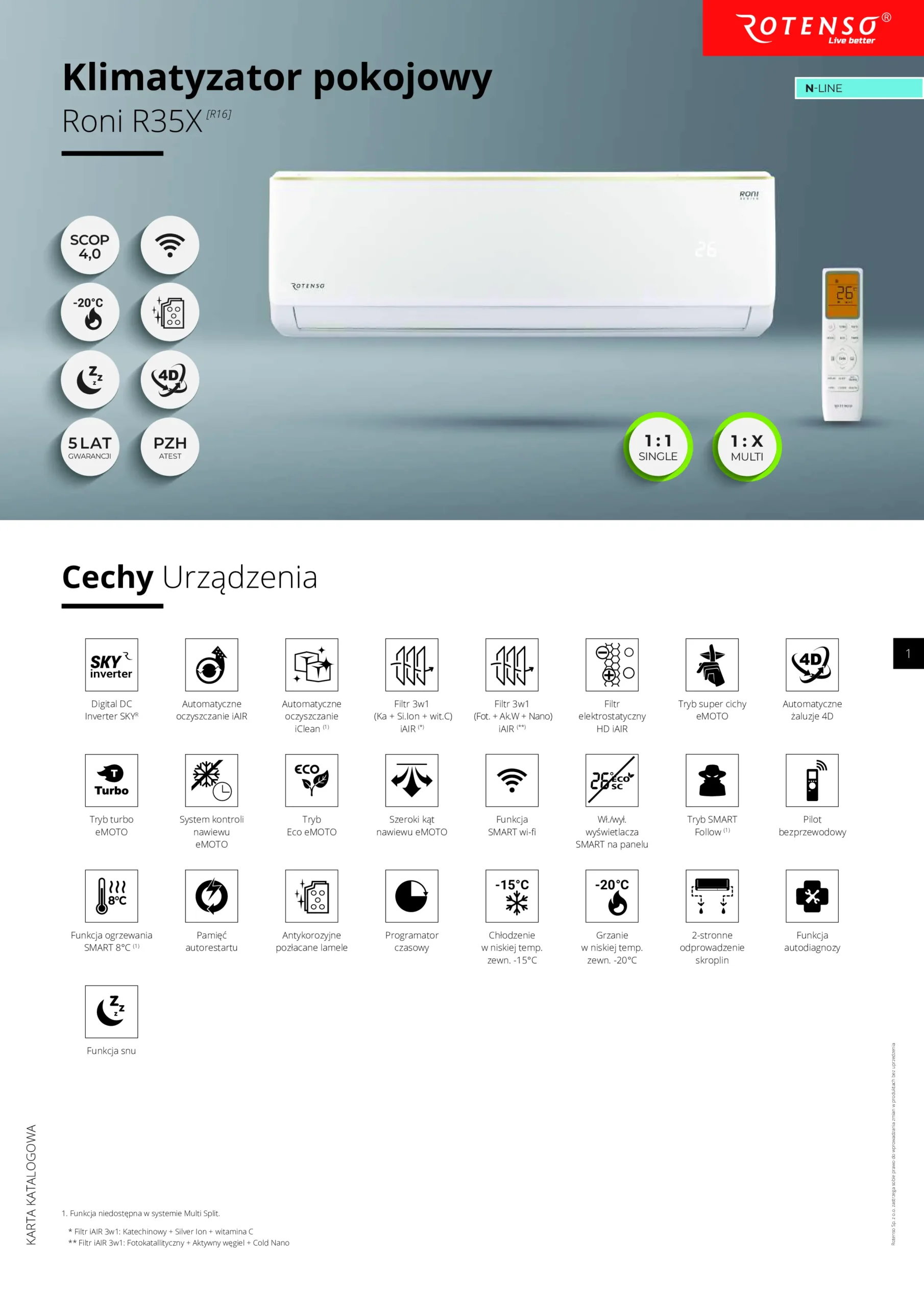 Klimatyzator Roni z serii X jest wyposażony w filtr elektrostatyczny HD iAIR oraz 2 filtry typu 3 w 1 /katechinowy + Silver Ion + witamina C/ i / fotokatalityczny + aktywny węgiel, Cold Nano/.