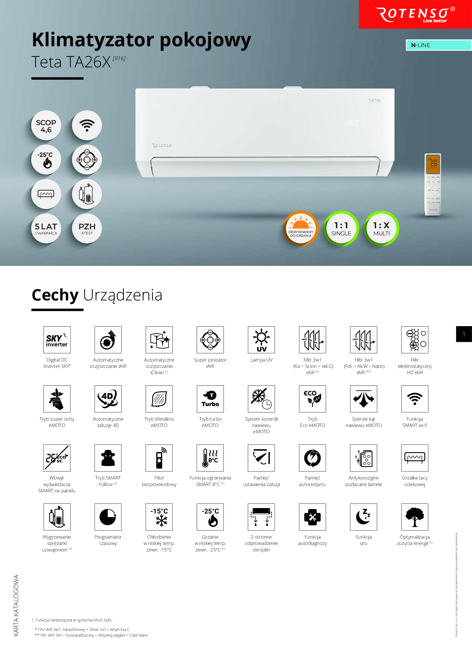 Klasa efektywności chłodzenia to A+++ (SEER 8,5), a ogrzewania to A++ (SCOP 4,6), znakomicie sprawdzi się do całorocznego ogrzewania pomieszczeń. Rotenso Teta pracuje efektywnie nawet przy niskich temperaturach zewnętrznych do -25°C. Posiada pakiet do pracy całorocznej w postaci grzałki tacy ociekowej oraz wygrzewania sprężarki uzwojeniem.