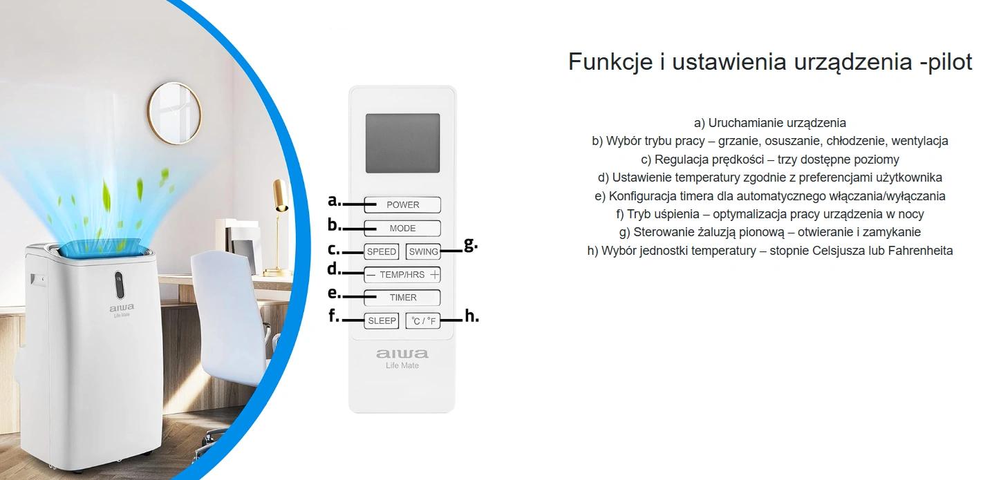 Model AIWA-PAC12Y2 to zaawansowane urządzenie oferujące wysoką moc chłodzenia, która skutecznie obniża temperaturę nawet w większych pomieszczeniach. Dzięki szerokiemu zakresowi regulacji temperatury (od 16°C do 31°C), możliwe jest dokładne dopasowanie parametrów pracy do preferencji użytkownika. Urządzenie efektywnie działa również w trybie wentylacji i osuszania powietrza – idealne rozwiązanie na upalne i wilgotne dni.