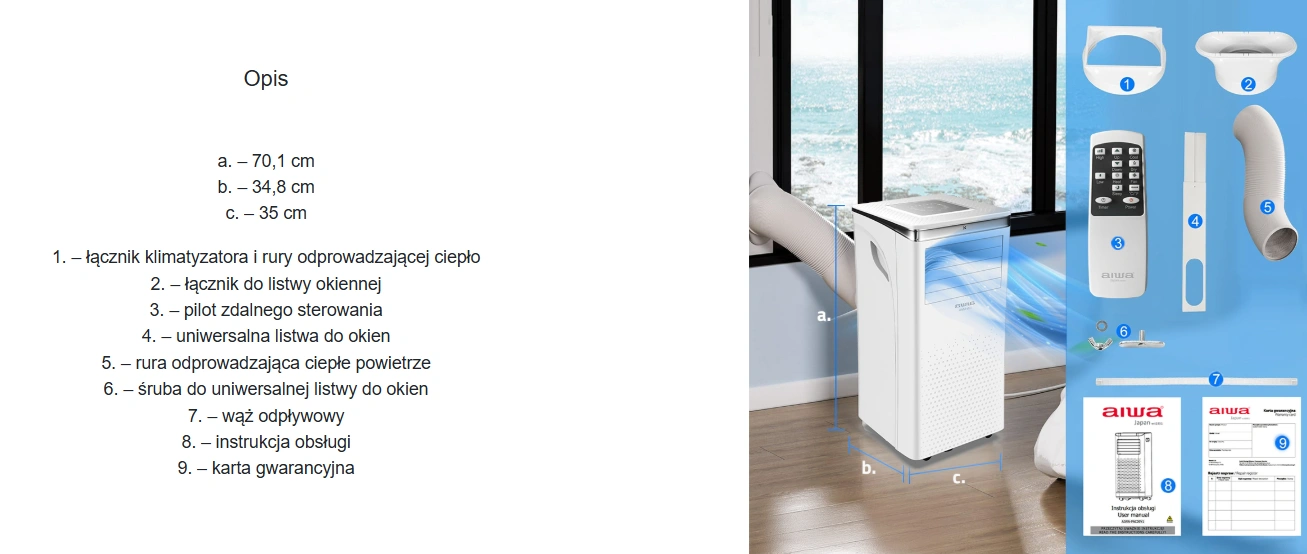 Jednym z największych atutów tego klimatyzatora jest jego mobilność. Dzięki obrotowym kółkom oraz kompaktowej konstrukcji urządzenie można łatwo przemieszczać między pomieszczeniami. W zestawie znajduje się również elastyczna rura odprowadzająca powietrze oraz adapter okienny, co pozwala na szybkie i bezinwazyjne uruchomienie urządzenia bez konieczności wykonywania trwałych przeróbek.