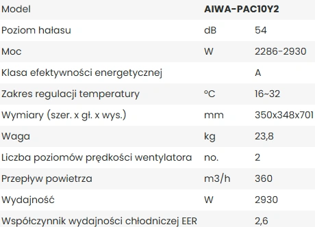 Model PAC10Y2 od AIWA został zaprojektowany tak, aby spełniał wymagania użytkowników poszukujących efektywnego chłodzenia bez potrzeby instalacji stałej klimatyzacji. Dzięki mocy 3,0 kW urządzenie może w krótkim czasie obniżyć temperaturę w średniej wielkości pomieszczeniu, zapewniając komfort w upalne dni. Dodatkowe funkcje osuszania oraz cyrkulacji powietrza pozwalają utrzymać odpowiedni mikroklimat również w deszczową lub wilgotną pogodę.
