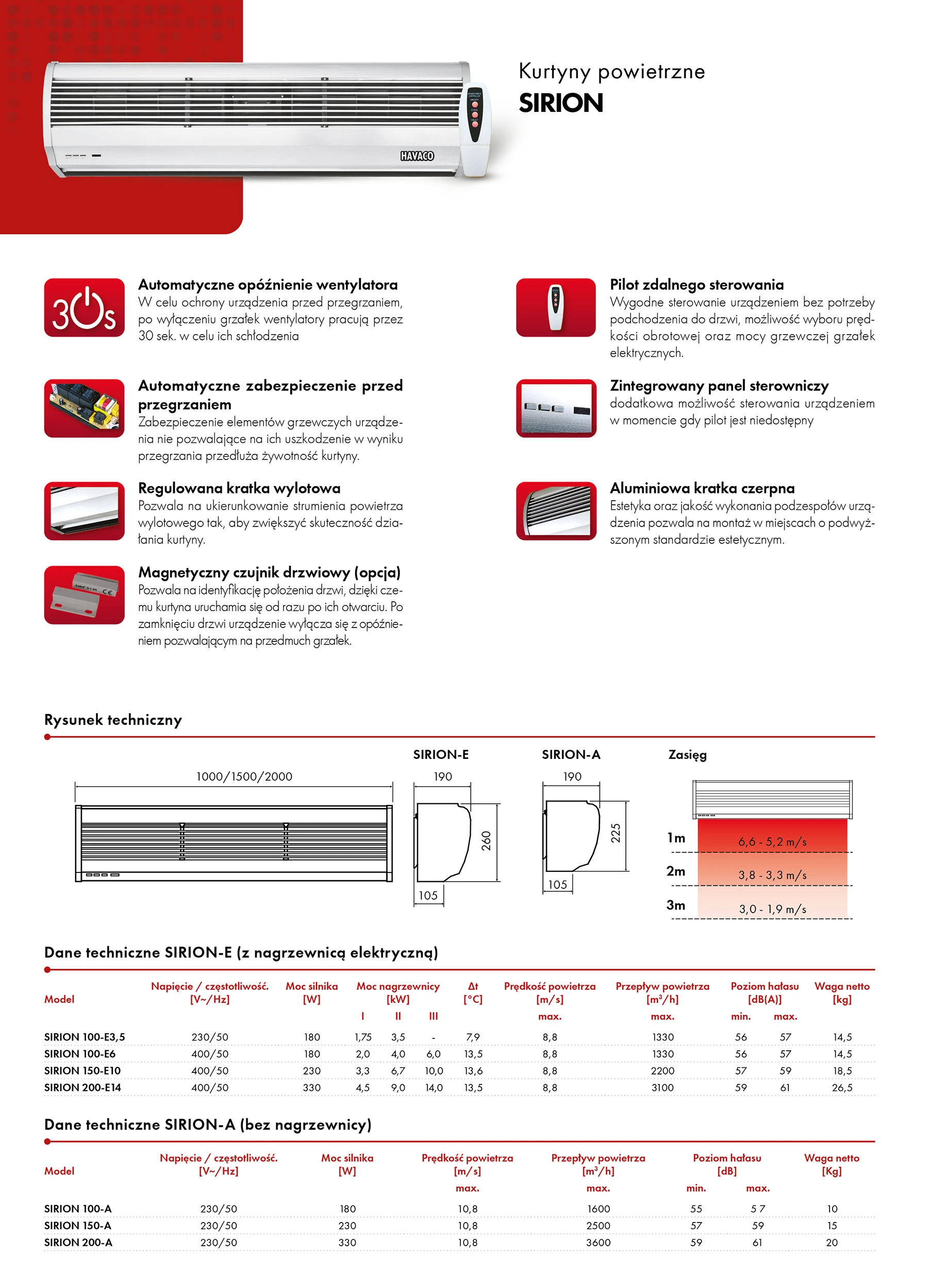 Seria „zimnych” kurtyn powietrznych HAVACO SIRION przeznaczona jest do montażu poziomego, naściennego lub podsufitowego na wysokości do 3,0 m. Dzięki zastosowaniu wysokowydajnych wentylatorów kurtyny SIRION skutecznie zatrzymują napływ powietrza zewnętrznego do obiektów klimatyzowanych i małych chłodni, tym samym ograniczają utratę energii poprzez otwarte drzwi tworząc przyjazny klimat wewnątrz pomieszczeń.