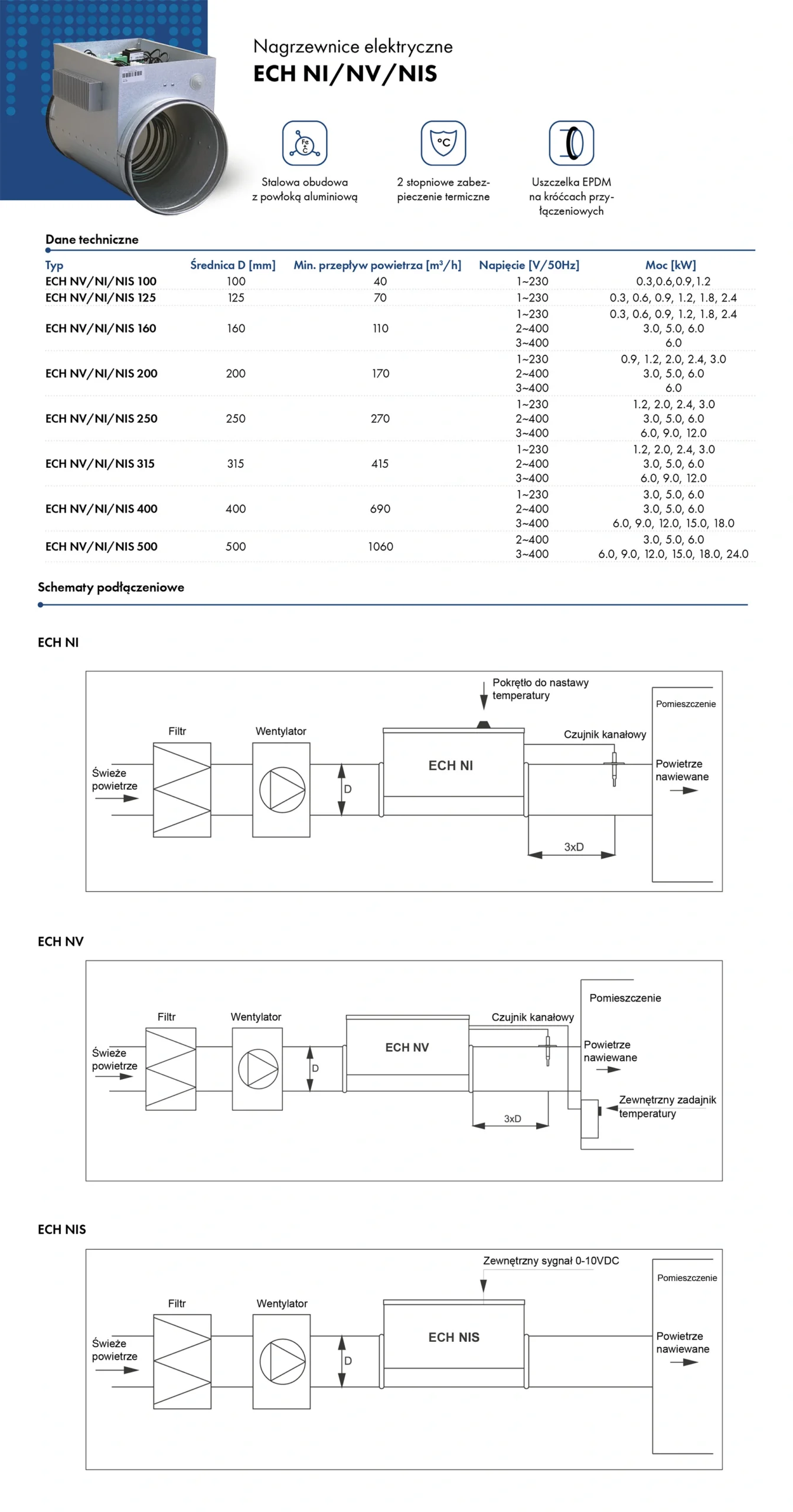 Nagrzewnice ECH są przystosowane do montażu w kanałach okrągłych. Występują w typowych średnicach wentylacyjnych od 100 do 500 mm i mocach od 0,3 do 24,0 kW. Każda nagrzewnica posiada dwustopniowe zabezpieczenie przed przegrzaniem: