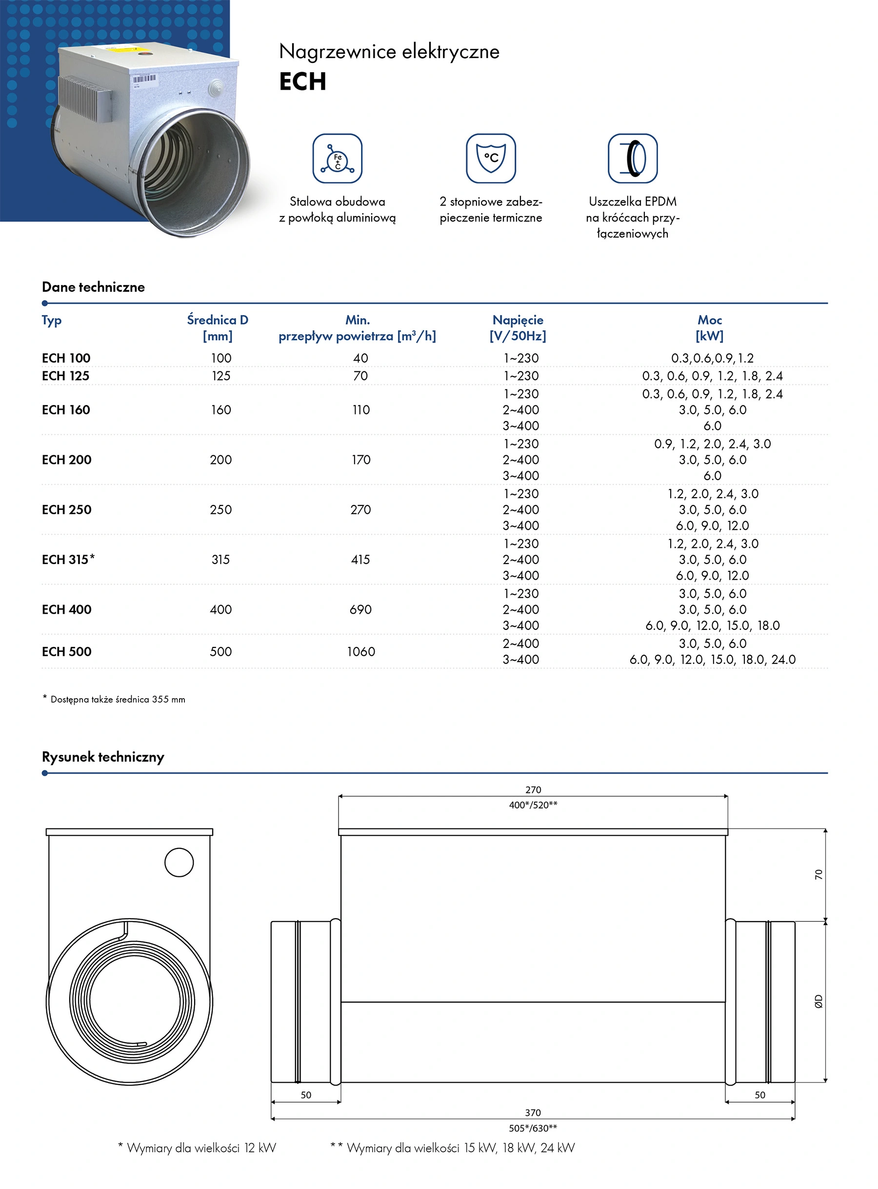 Nagrzewnice ECH są przystosowane do montażu w kanałach okrągłych. Występują w typowych średnicach wentylacyjnych od 100 do 500 mm i mocach od 0,3 do 24,0 kW.