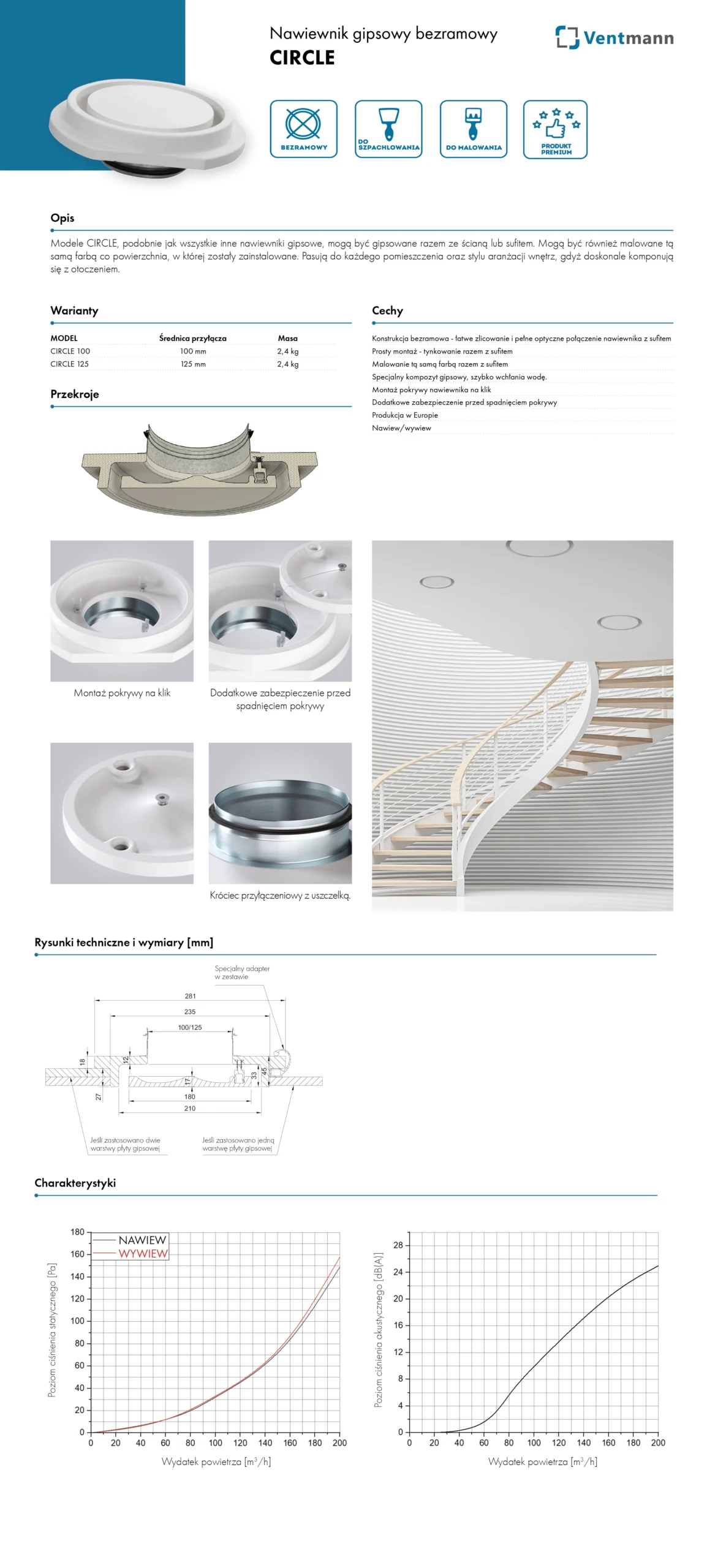 Nawiewnik gipsowy CIRCLE podobnie jak wszystkie inne nawiewniki gipsowe, mogą być gipsowane razem ze ścianą lub sufitem. Mogą być również malowane tą samą farbą co powierzchnia, w której zostały zainstalowane. Pasują do każdego pomieszczenia oraz stylu aranżacji wnętrz, gdyż doskonale komponują się z otoczeniem.
