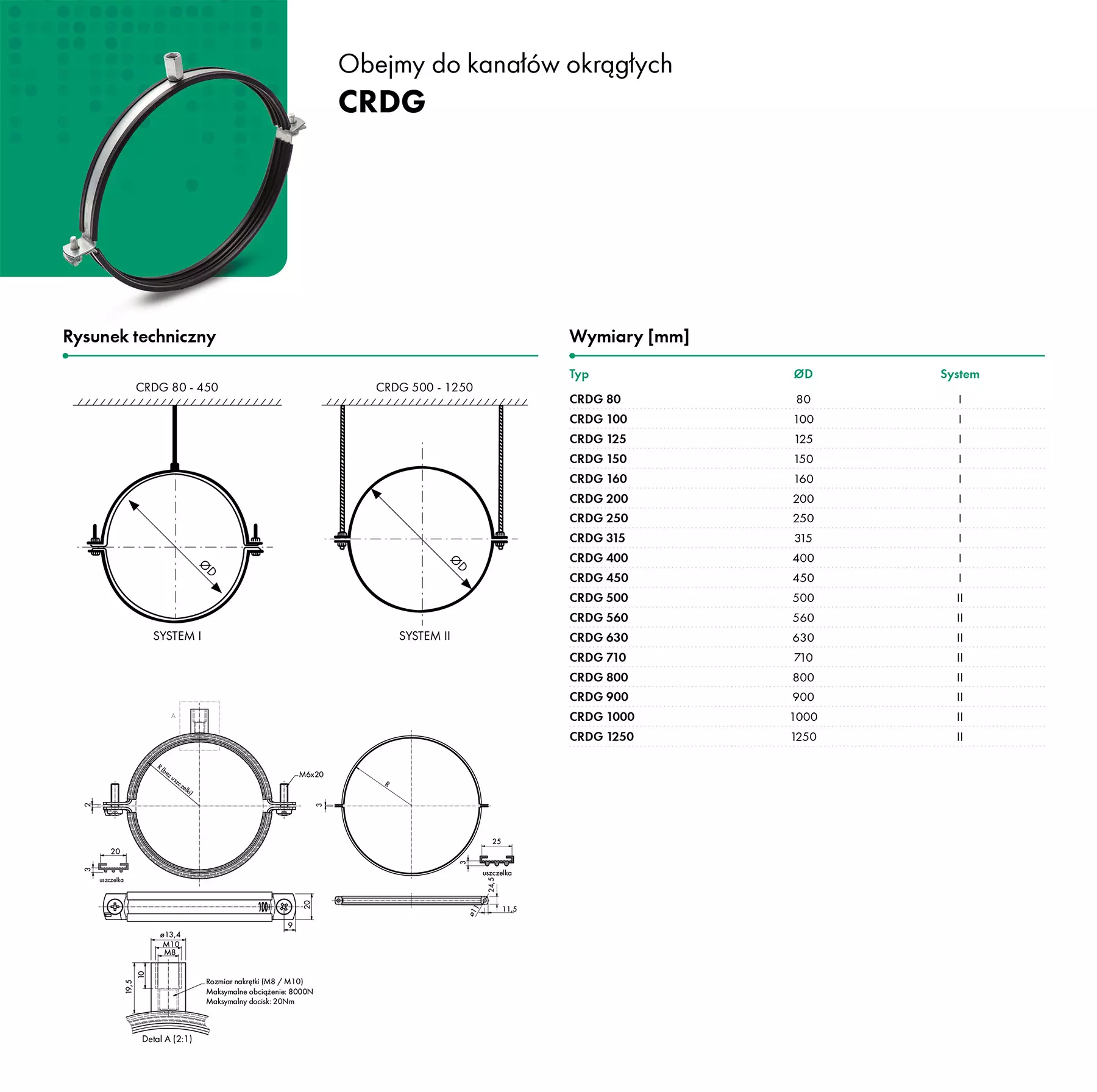 Obejma do kanału okrągłego CRDG wykonana jest z dwóch części połączonych ze sobą za pomocą śrub stalowych. Do średnicy 450 mm włącznie jedna strona jest samozatrza- skowa, dzięki temu usprawnia montaż obejm na kanałach wentylacyjnych. W tym zakresie średnic obejma montowana jest poprzez nitonakrętkę M8/M10 do pręta gwintowanego lub do śruby dwu-gwintowej. Z uwagi na bezpieczeństwo montażu instalacji wentylacyjnej, średnice od fi 500 mm powinny być montowane za pomocą dwóch prętów gwintowanych. Obejmy CRDG standardowo są wyposażone w gumową uszczelkę EPDM z możliwością jej usunięcia.