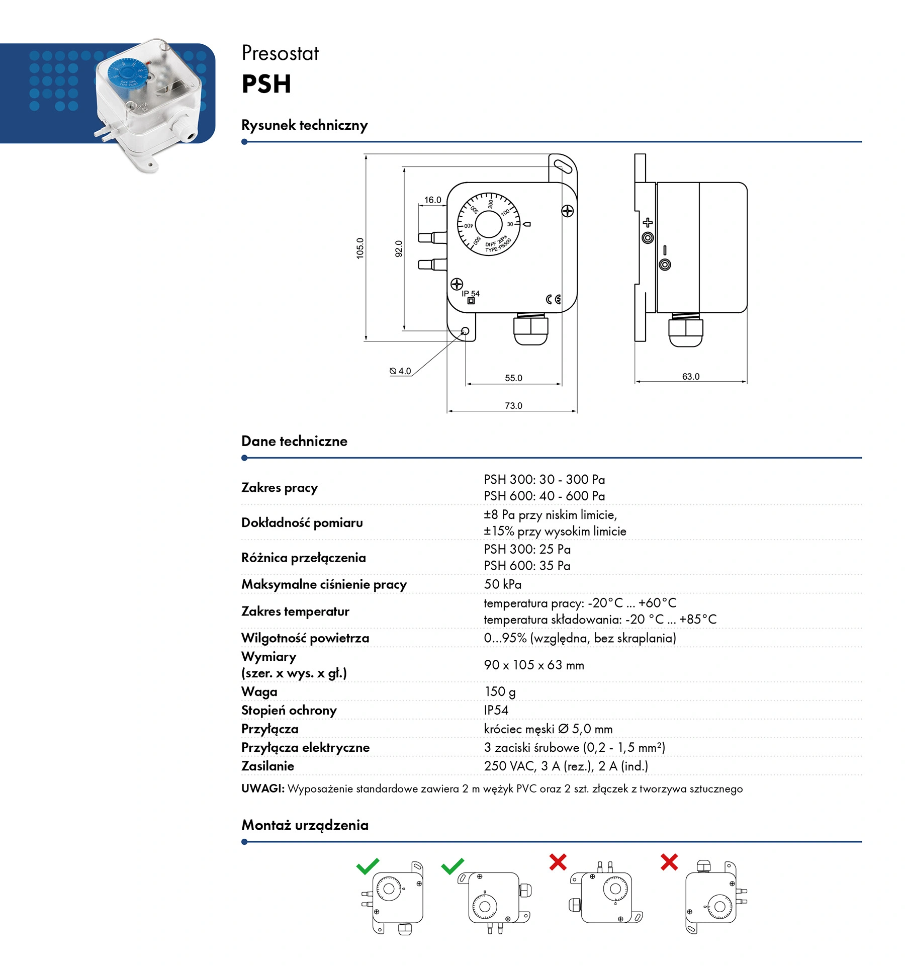 Presostat PSH 300 to czujnik różnicy ciśnień, informuje o spadku przepływu powietrza wskutek różnicy ciśnień, np.: zanieczyszczonego filtra lub uszkodzonego wentylatora