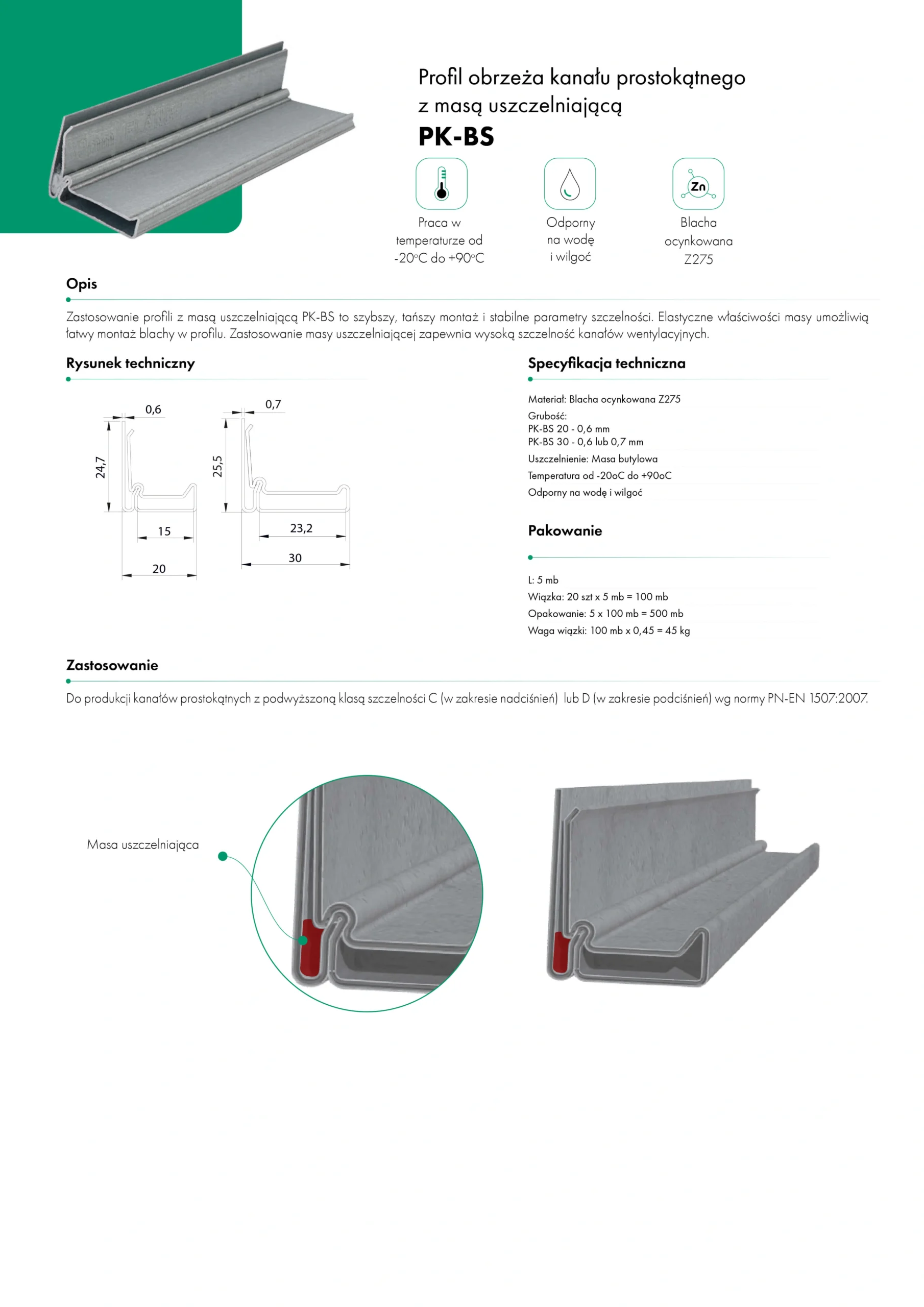 Zastosowanie profili z masą uszczelniającą PK-BS to szybszy, tańszy montaż i stabilne parametry szczelności. Elastyczne właściwości masy umożliwią łatwy montaż blachy w profilu. Zastosowanie masy uszczelniającej zapewnia wysoką szczelność kanałów wentylacyjnych.