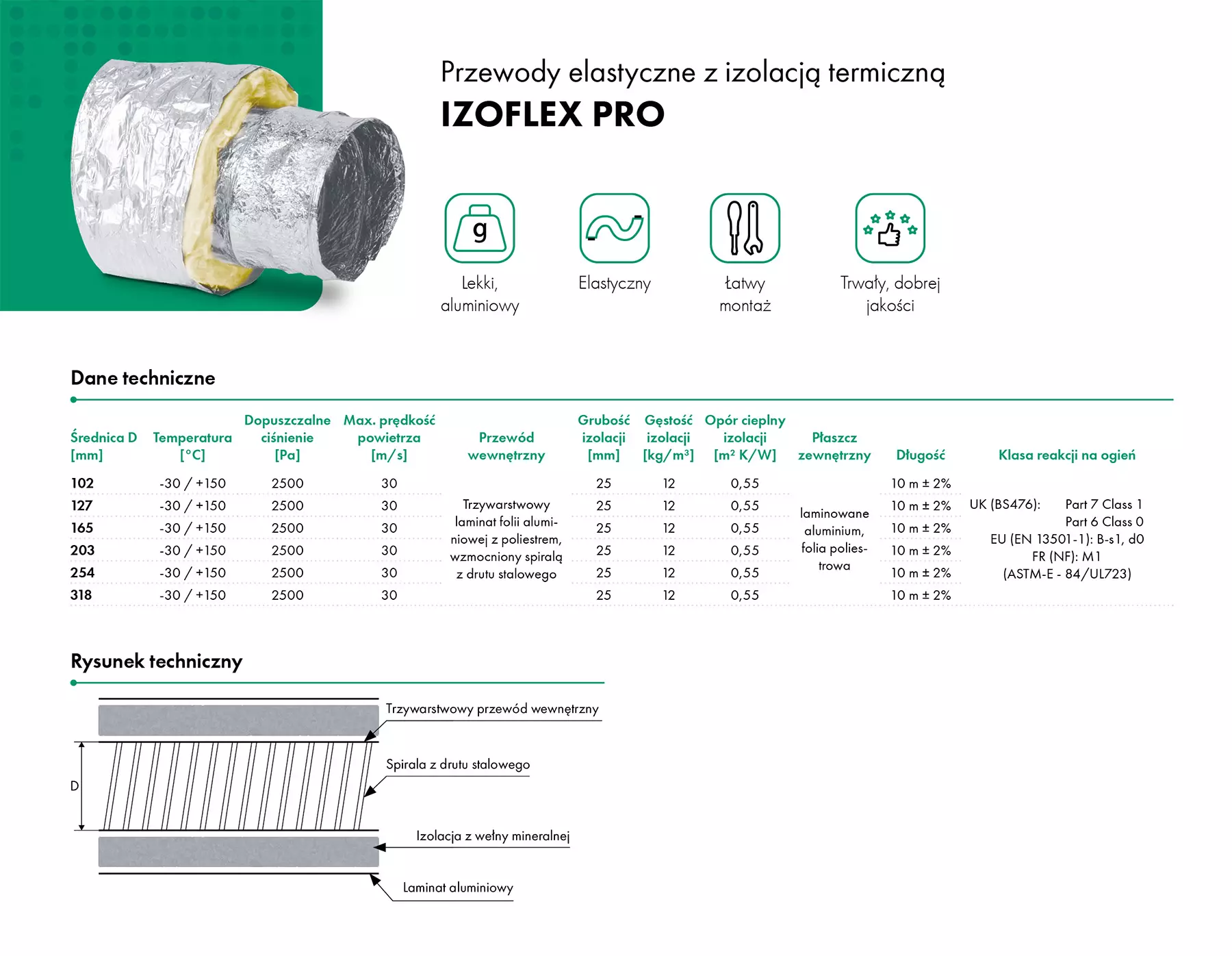 Przewód wewnętrzny jest wykonany z dwu warstwowego laminatu folii aluminiowej z poliestrem, wzmocniony spiralą z drutu stalowego. Warstwę izolacyjną stanowi wełna mineralna o grubości 25 mm. Powłoka zewnętrzna składa się z dwóch warstw: laminowanego aluminium i folii poliestrowej. Przewód występuje w odcinkach 10 m i jest pakowany w kartony o długości 1m.