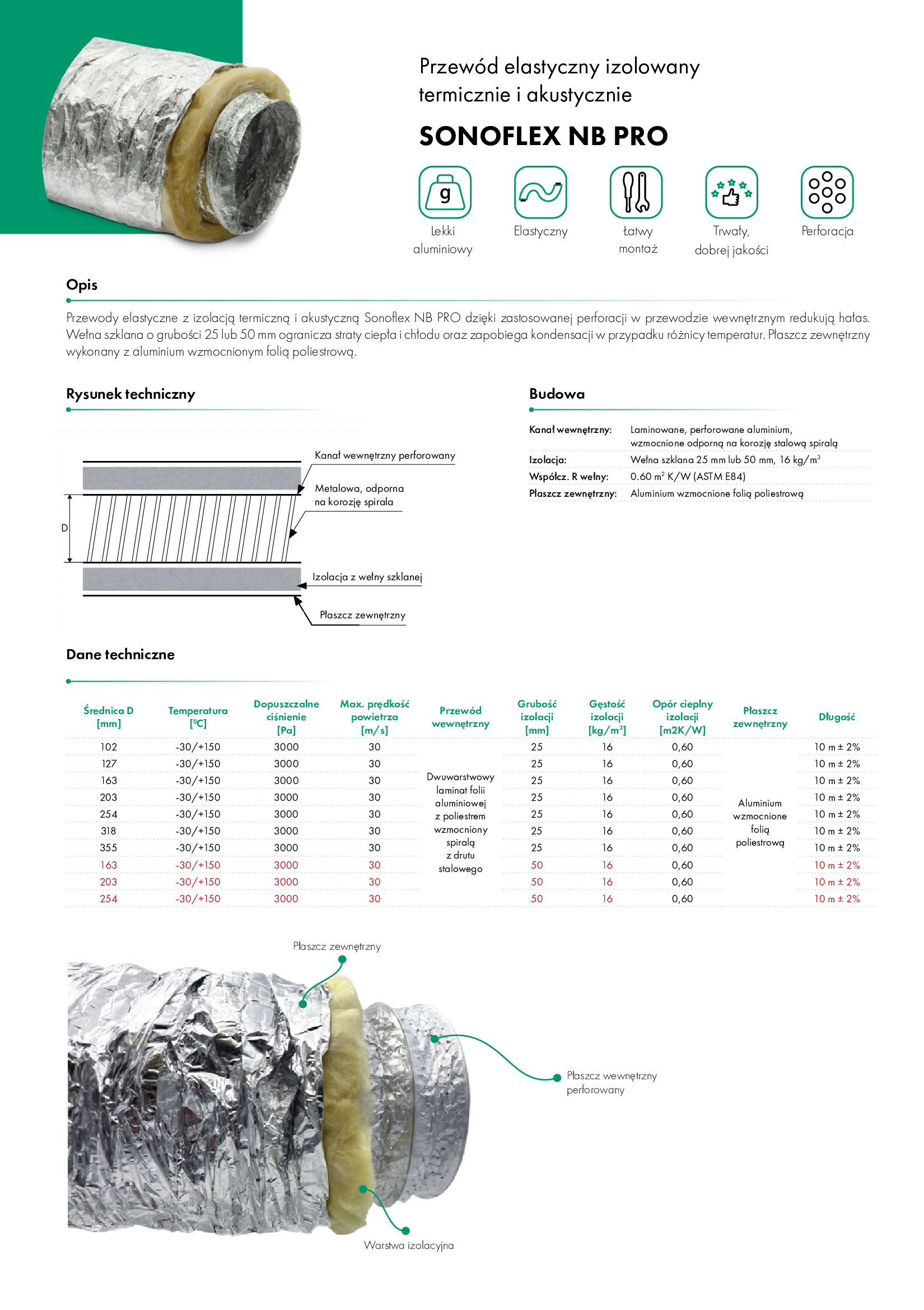 SONOFLEX NB PRO to wysokiej klasy przewód elastyczny, zaprojektowany z myślą o wymagających zastosowaniach, w których istotna jest zarówno izolacja akustyczna, jak i termiczna. Dzięki 25-milimetrowej warstwie izolacyjnej, perforowanemu kanałowi wewnętrznemu oraz solidnemu wykonaniu, produkt ten spełnia najwyższe standardy w zakresie efektywności energetycznej, komfortu akustycznego oraz trwałości instalacji wentylacyjnych.