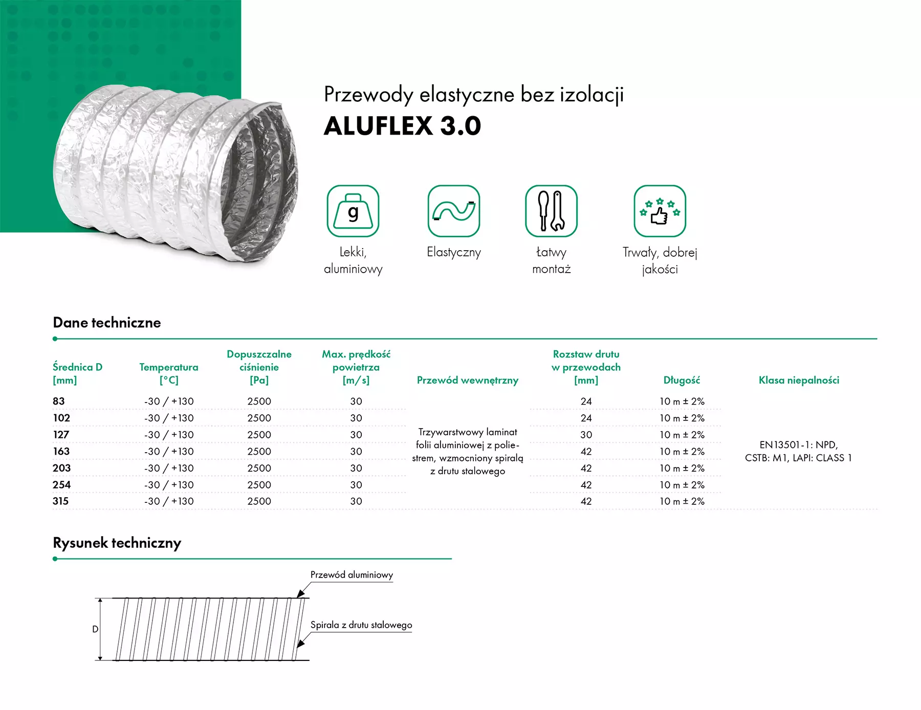 Przewód elastyczny nieizolowany ALUFLEX 3.0 HAVACO jest nieizolowanym przewodem elastycznym przeznaczonym do stosowania w instalacjach wentylacyjnych i klimatyzacyjnych.