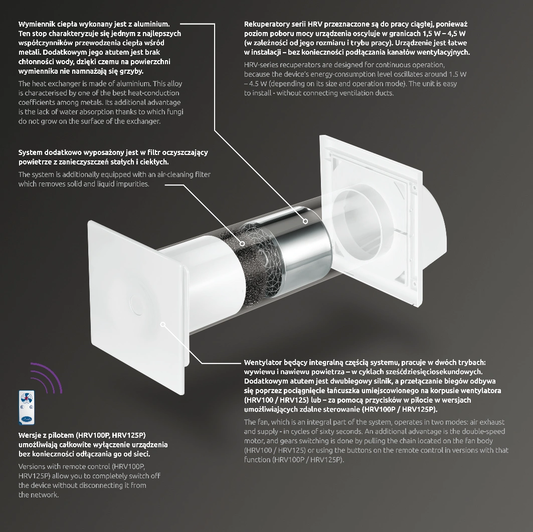Z uwagi na niewielkie wymiary, rekuperator HRV100 doskonale sprawdza się w pomieszczeniach, w których przestrzeń jest ograniczona. Montaż urządzenia jest szybki i bezproblemowy, dzięki możliwości instalacji w ścianach technicznych, a także w innych mniej dostępnych miejscach. Jego kompaktowa budowa pozwala na oszczędność miejsca, nie rezygnując przy tym z efektywności wentylacji i odzysku ciepła.