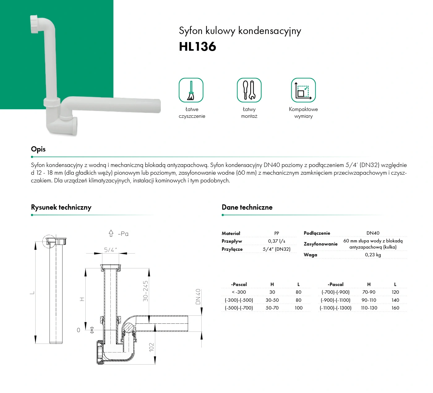Syfon kulowy kondensacyjny HL136 z wodną i mechaniczną blokadą anty zapachową. DN40 poziomy z podłączeniem 5/4′ (DN32) względnie d 12 – 18 mm (dla gładkich węży) pionowym lub poziomym. Zasyfonowanie wodne (60 mm) z mechanicznym zamknięciem przeciw zapachowym i czyszczakiem.