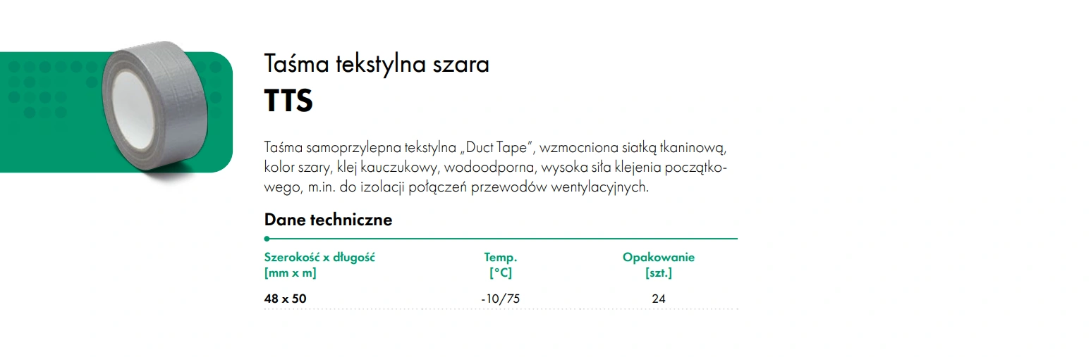 Taśma tekstylna szara TTS HAVACO samoprzylepna „Duct Tape” (TTS). Wzmocniona siatką tkaninową. Kolor szary. Klej kauczukowy, wodoodporna, wysoka siła klejenia początkowego. Odporna na temperaturę od -10°C do +75°C. Służy m.in. do izolacji połączeń przewodów wentylacyjnych.