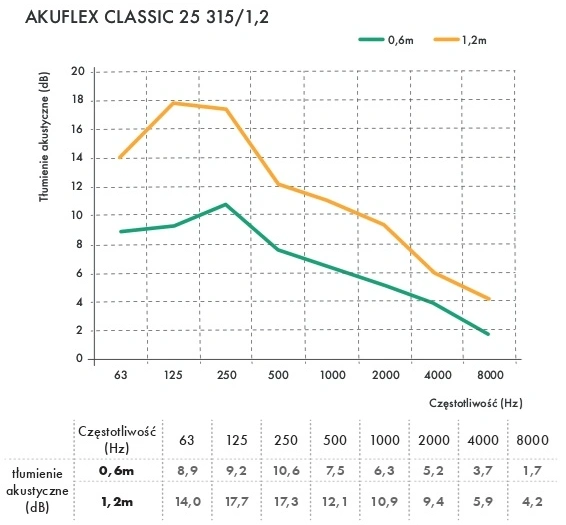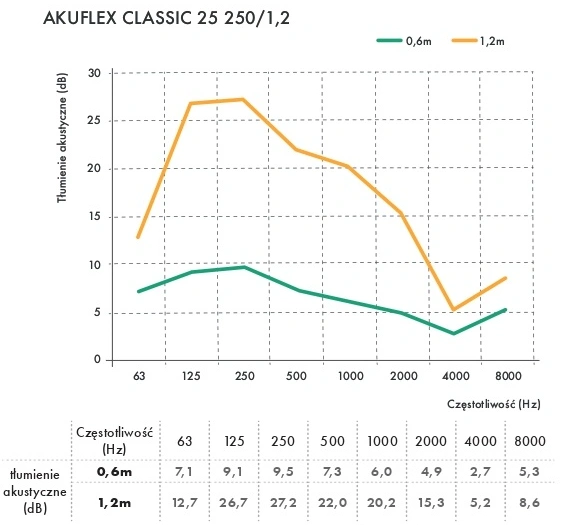 Dzięki grubości warstwy dźwiękochłonnej wynoszącej 25 mm, AKUFLEX CLASSIC 25 skutecznie tłumi hałas w zakresie średnich i wysokich częstotliwości, redukując nieprzyjemne dźwięki o kilka do kilkunastu decybeli w zależności od warunków pracy.