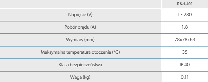 Regulator RS-1-400 charakteryzuje się solidną i kompaktową konstrukcją, która zapewnia trwałość oraz odporność na uszkodzenia mechaniczne. Obudowa wykonana z wysokiej jakości materiałów chroni urządzenie przed niekorzystnymi warunkami zewnętrznymi. Panel sterujący z wyraźnymi wskaźnikami LED umożliwia intuicyjne monitorowanie ustawień oraz parametrów pracy.