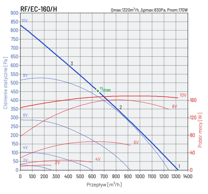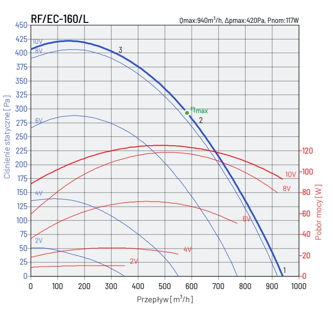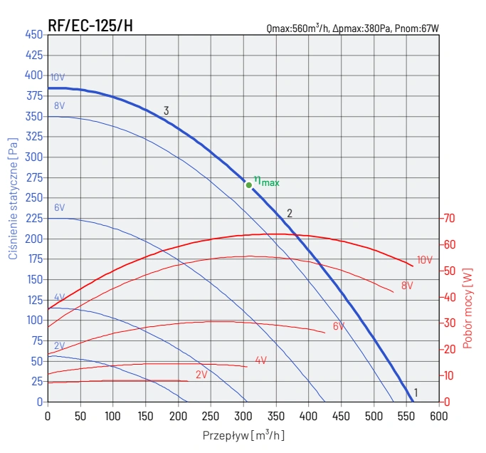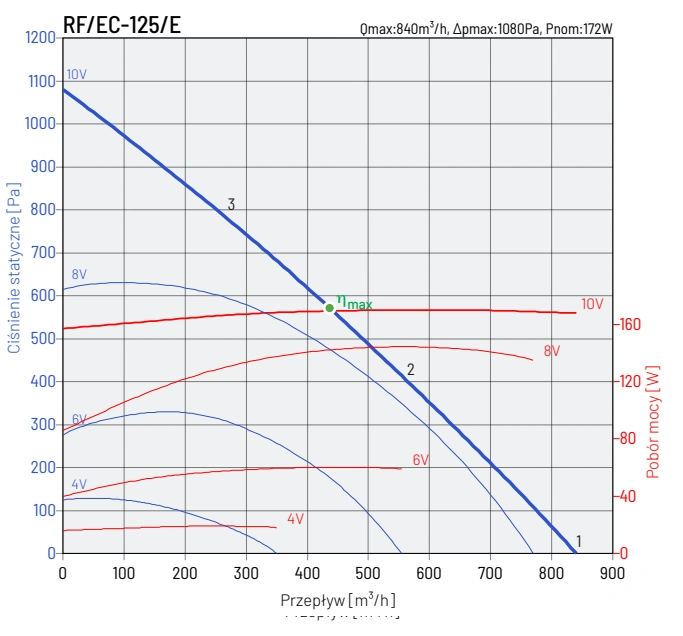 Wentylator RF EC wyposażony jest w wysokoefektywny silnik zintegrowany z technologią EC (Electronic Commutation), co pozwala na znaczne zmniejszenie zużycia energii elektrycznej oraz redukcję emisji CO₂. Silnik posiada wejście sterujące 0-10VDC, umożliwiające płynną regulację obrotów, co pozwala na dostosowanie pracy wentylatora do aktualnych potrzeb systemu wentylacyjnego.