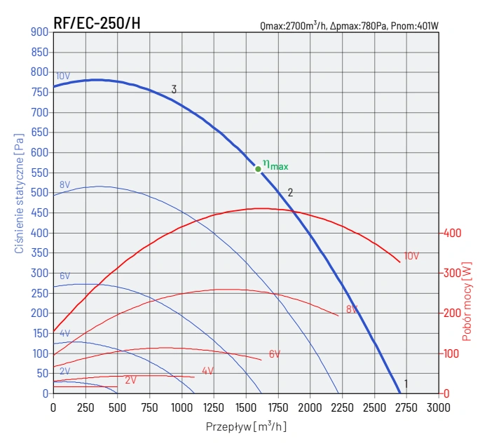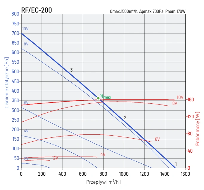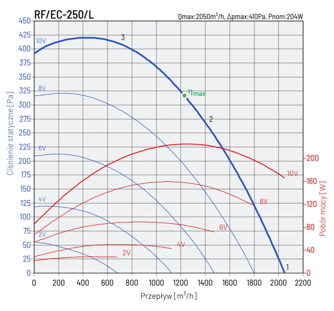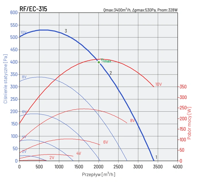 W zależności od modelu, wentylatory RF EC mogą być zasilane jednofazowo (230V, 50Hz) lub trójfazowo (400V, 50Hz). Modele 125/L, 125/H, 160/L i 250/L charakteryzują się klasą izolacji B i stopniem ochrony IP44, natomiast modele 125/E, 160/H, 200, 250/H, 315S, 315T, 355-500 posiadają klasę izolacji F i stopień ochrony IP54.