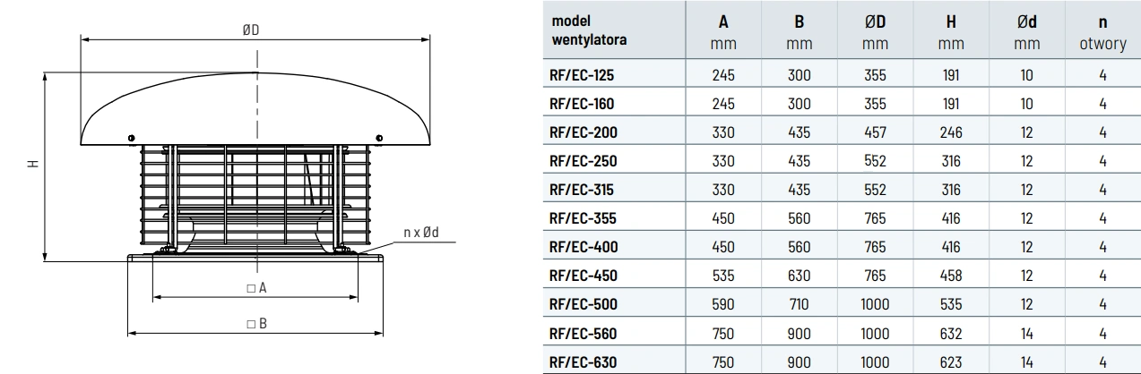 Wentylatory RF EC dostępne są w różnych modelach, dostosowanych do konkretnych potrzeb użytkowników. Modele o średnicach od 125 do 315 mm wyposażone są w wirniki z łopatkami pochylonymi do tyłu, wykonane z tworzywa sztucznego. Obudowa, podstawa oraz górna czasza tych modeli wykonane są z blachy aluminiowej, co zapewnia lekkość i odporność na korozję. Siatka ochronna, zabezpieczająca przed dostępem do wirnika, wykonana jest ze stalowego drutu i poddana procesowi cynkowania, co zwiększa jej trwałość.