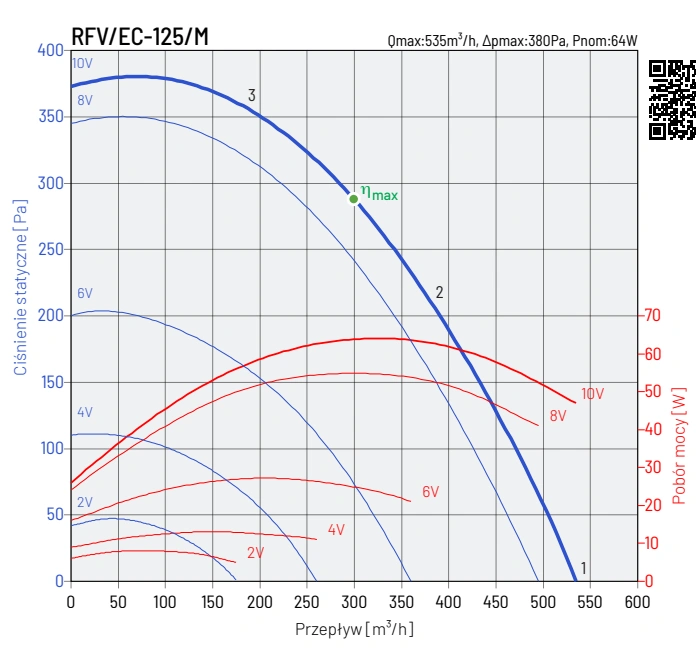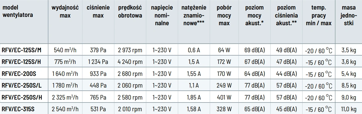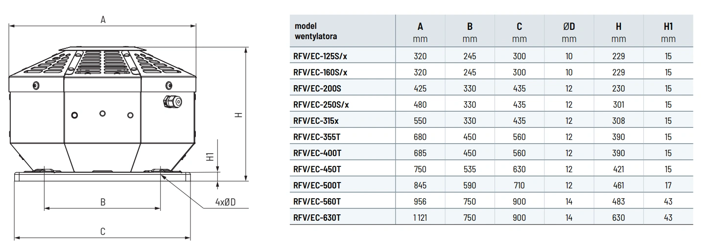 Wentylatory RFV EC dostępne są w różnych modelach, dostosowanych do konkretnych potrzeb użytkowników. Modele wyposażone są w wirniki z łopatkami pochylonymi do tyłu, wykonane z tworzywa sztucznego. Obudowa wentylatora wykonana jest z blachy stalowej cynkowanej, co zapewnia odporność na korozję i trwałość. Wentylatory te przystosowane są do pracy w pozycji pionowej i mogą być montowane na dachach płaskich, a po zastosowaniu odpowiednich podstaw dachowych również na dachach pochyłych. Temperatura pracy urządzenia wynosi od -30°C do +60°C, w zależności od modelu.