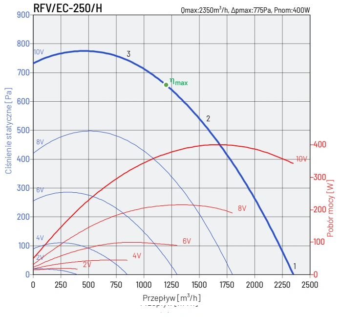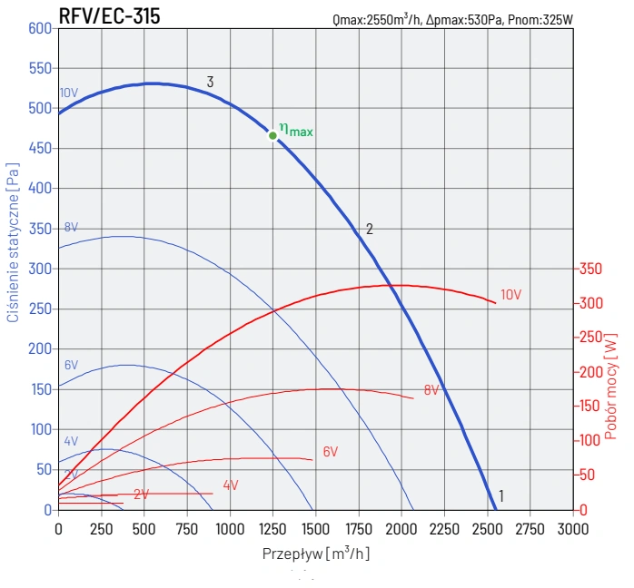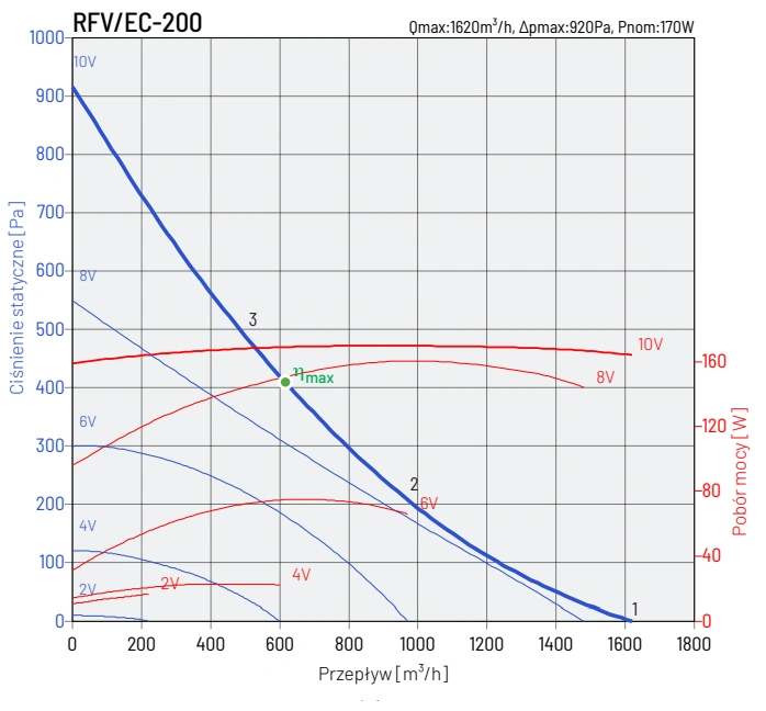 W wentylatorach RFV/EC stosowane są wirniki z łopatkami pochylonymi do tyłu, z tworzywa sztucznego. Wentylator wykonany z blachy stalowej cynkowanej.