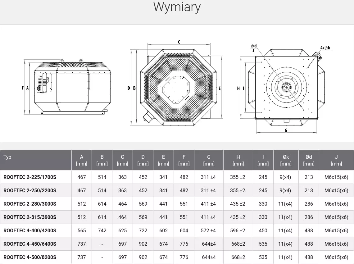 Dachowy wentylator promieniowy z wyrzutem pionowym, którego silnik zamontowany został poza strumieniem przepływającego powietrza. Wentylator został przystosowany do przetłaczania powietrza o maksymalnej temperaturze do 1200C.