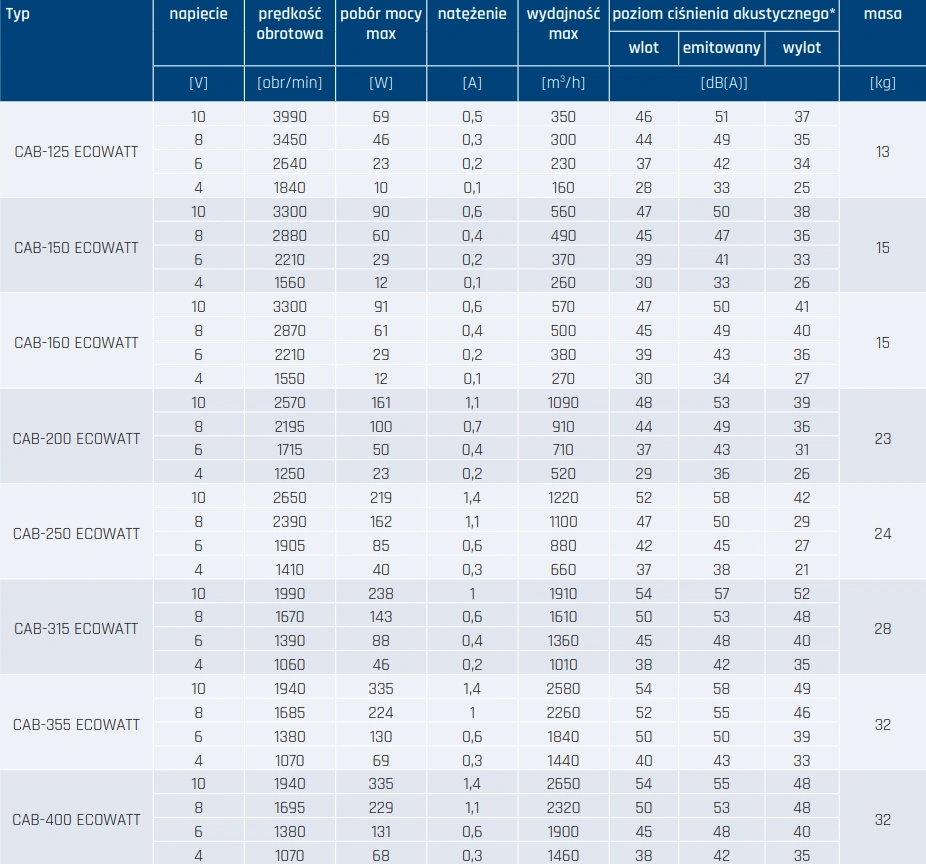 - stopień ochrony IP44, klasa izolacji B (CAB 100 do CAB 250),