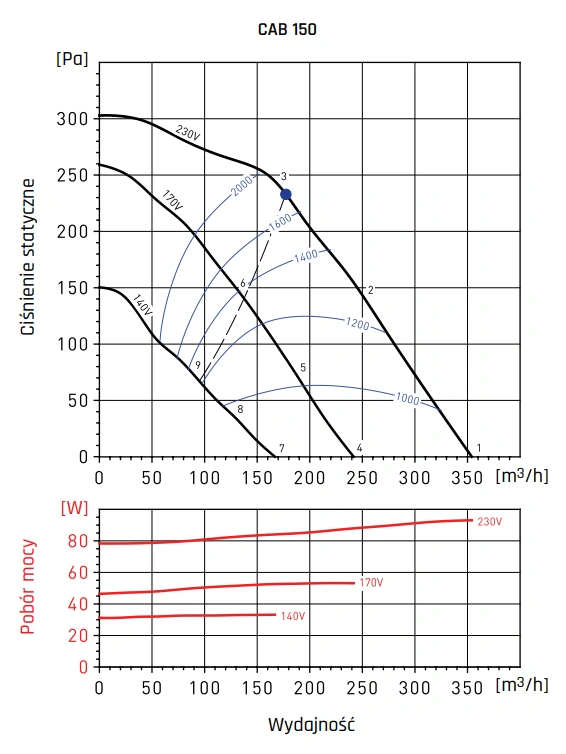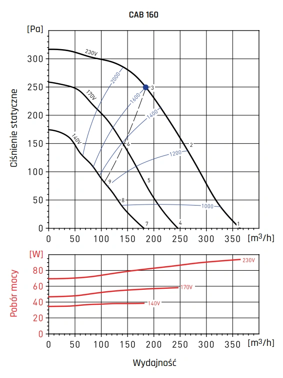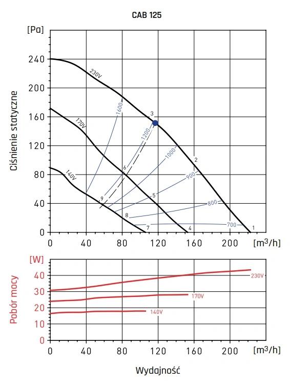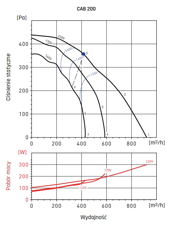 Wentylator CAB wyposażony jest w jednofazowy silnik elektryczny 230 V, 50/60 Hz (dla modeli CAB 100 do CAB 160) lub 50 Hz (dla modeli CAB 200). Silnik posiada termiczne zabezpieczenie uzwojenia przed przeciążeniem oraz łożyska kulkowe, co zapewnia długą żywotność i niezawodność pracy. Stopień ochrony IP44 oraz klasa izolacji B gwarantują bezpieczne użytkowanie urządzenia w różnych warunkach eksploatacyjnych.