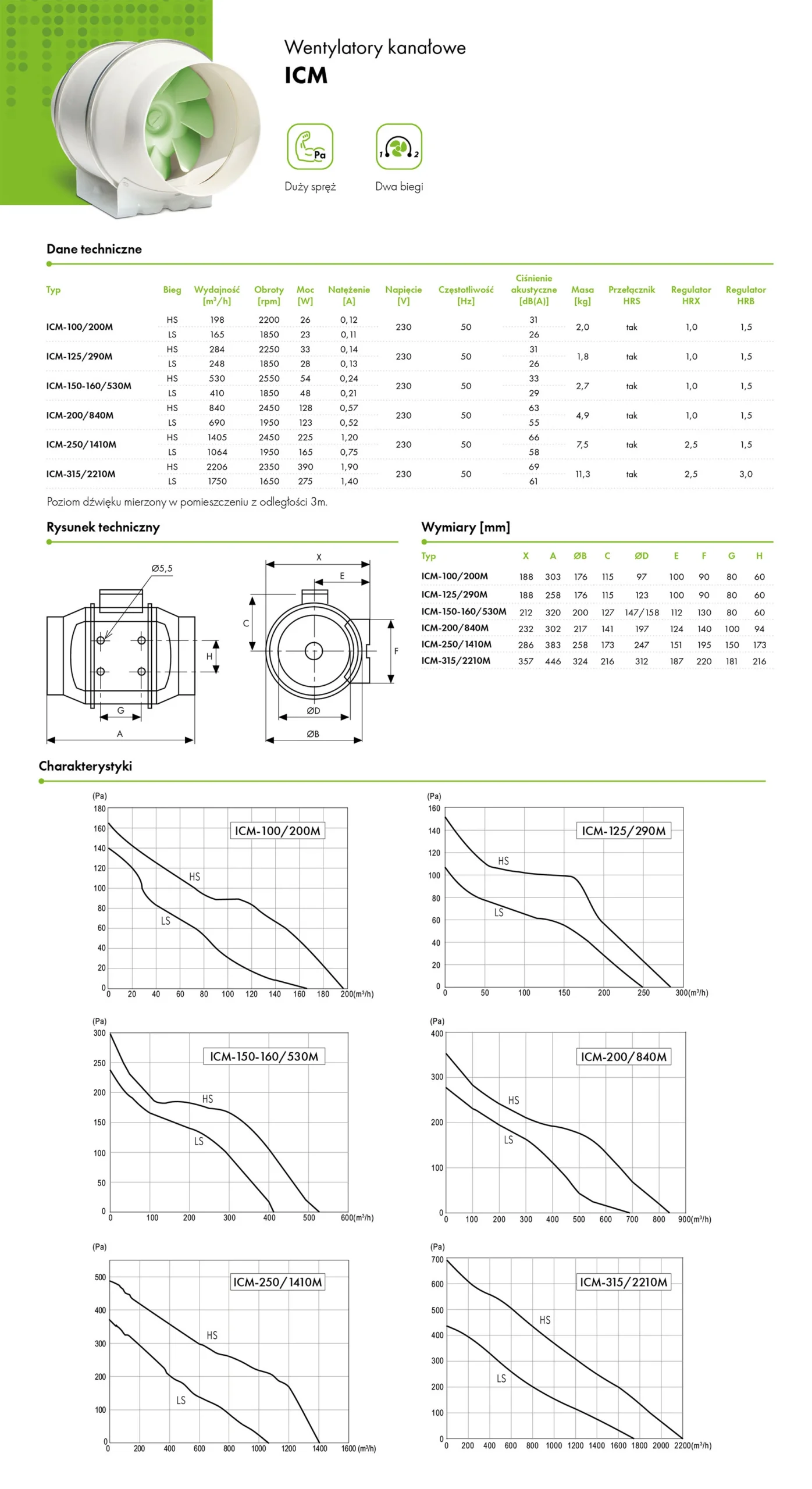 Wentylator kanałowy ICM przystosowany do transportu niezanieczyszczonego powietrza. Idealnie nadaje się do instalacji nawiewnych, jak i wyciągowych budynków mieszkalnych, użyteczności publicznej, biur, sklepów. Urządzenie możemy również stosować do instalacji wyciągowych z okapów kuchennych – wymagane jest zastosowanie filtrów tłuszczowych
