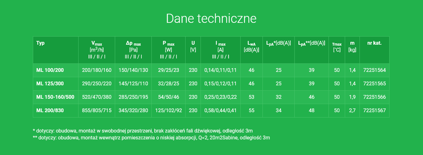 Wentylatory ML posiadają trzybiegowy asynchroniczny silnik elektryczny 1~230V, 50Hz, wyposażony w łożyska kulkowe oraz zintegrowane zabezpieczenie termiczne. Wentylatory występują w dwóch seriach różniących się od siebie sposobem regulacji obrotów. W pierwszej serii, regulacji należy dokonać podczas montażu i podłączenia, za pomocą zworki należy zdefiniować na stałe jedną z trzech prędkości obrotowych wentylatora. Możliwa również w tej serii jest regulacja silnika poprzez obniżenie napięcia zasilającego w zakresie od 120-230V. Uwaga! W tym celu należy skonfigurować wentylator do pracy na najwyższym biegu. Dodatkowo modele 100 i 160 dostępne są w wersji z regulowanym opóźnieniem czasowym wyłączenia w zakresie 3-25 minut.