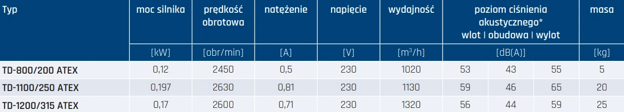 Model TD ATEX charakteryzuje się wysoką wydajnością przepływu powietrza, co umożliwia skuteczną wentylację nawet w dużych pomieszczeniach. Solidne wykonanie oraz zastosowanie materiałów odpornych na działanie czynników chemicznych i korozję zapewniają długotrwałą pracę urządzenia bez potrzeby częstej konserwacji. Wentylator wyposażono w silnik przystosowany do pracy w strefach zagrożonych wybuchem, co gwarantuje niezawodność i bezpieczeństwo.