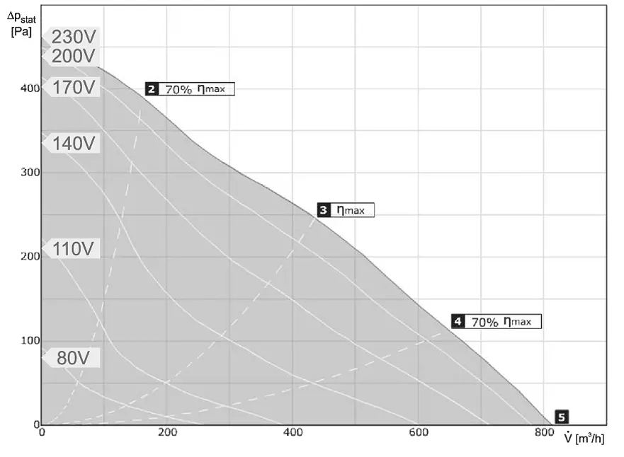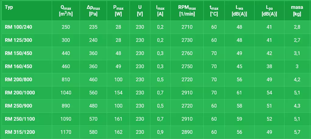 Dane techniczne, wymiary oraz charakterystyki pracy każdego z wentylatorów znajdą Państwo powyżej, odpowiednio w zakładkach Dane Techniczne / Wymiary / Charakterystyka Pracy