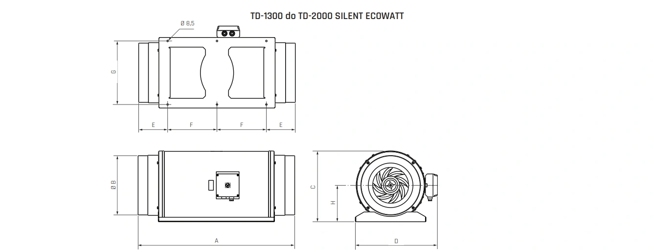 Dzięki specjalnie zaprojektowanej konstrukcji, TD SILENT ECOWATT charakteryzuje się znacznie zredukowanym poziomem hałasu w porównaniu do standardowych wentylatorów kanałowych. Obudowa posiada dodatkowe warstwy izolacyjne, które skutecznie tłumią dźwięk generowany przez silnik oraz przepływ powietrza.