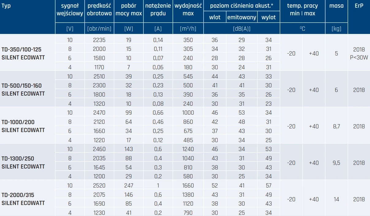 Wentylatory mogą być montowane w pozycji poziomej lub pionowej, co daje szerokie możliwości zastosowania w różnego rodzaju instalacjach. Łatwy dostęp do silnika i podzespołów zapewnia prostą konserwację i skraca czas serwisu. Modele TD SILENT ECOWATT są również wyposażone w silniki prądu stałego EC, które pozwalają na dokładną i płynną regulację prędkości obrotowej oraz niższe zużycie energii, co przekłada się na realne oszczędności eksploatacyjne.