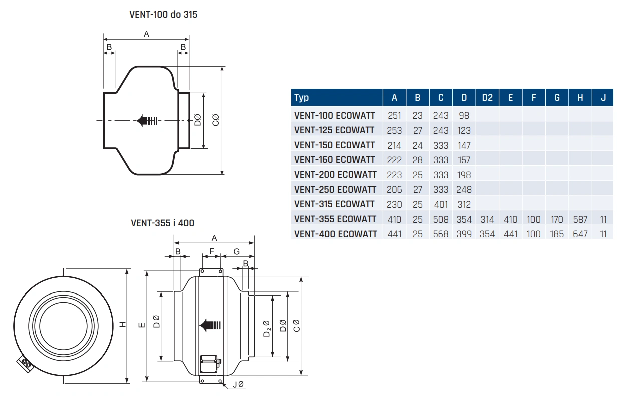 Wentylatory serii VENT ECOWATT posiadają trwałą konstrukcję przystosowaną do montażu w systemach kanałowych w pozycji pionowej lub poziomej. Obudowa wykonana jest z blachy stalowej galwanizowanej, malowanej farbą poliestrową, co zapewnia odporność na korozję i uszkodzenia mechaniczne.