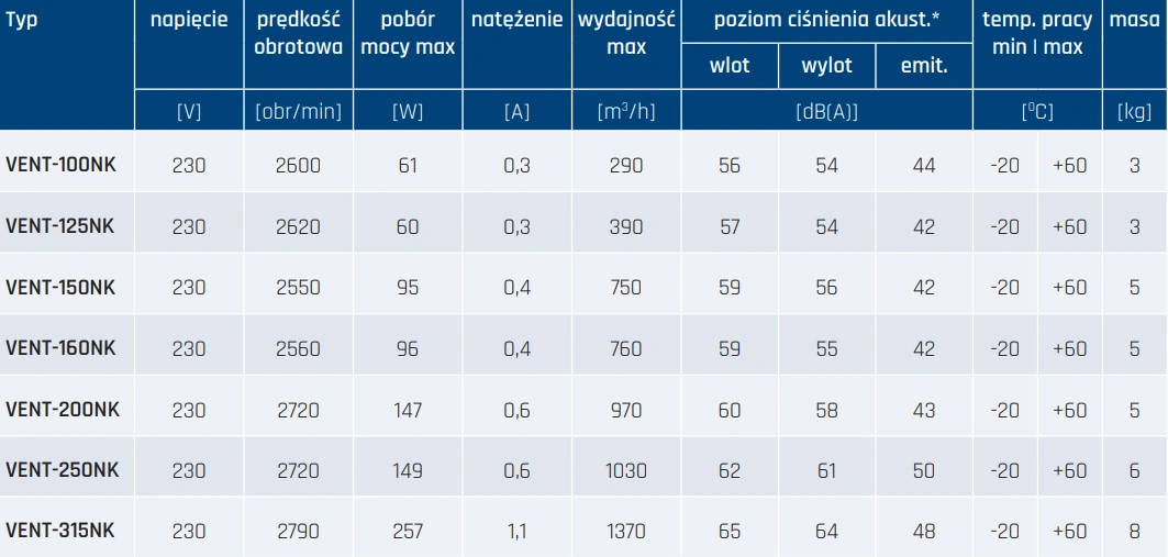 Wentylatory VENT-NK to idealne rozwiązanie dla instalacji, w których liczy się niezawodność, łatwość montażu i energooszczędność. Dzięki szerokiemu zakresowi modeli (od średnic 100 mm do 315 mm), użytkownik może dobrać urządzenie odpowiednie do konkretnych warunków projektowych – zarówno pod względem wydajności, jak i poziomu hałasu.