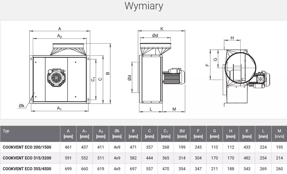 Wentylator promieniowy z silnikiem zlokalizowanym poza strumieniem przetłaczanego powietrza przeznaczony do stosowania w instalacjach wyciągowych kuchennych.