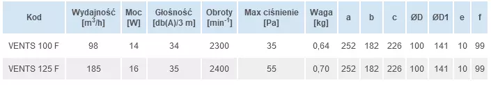 Wentylator Osiowy Vents F wykonany z plastiku, domowy, połączony z kratką grawitacyjną, preferowany montaż ścienny. Wentylatory wywiewne, zapewniające wysoki poziom komfortu, przeznaczone do wentylacji pomieszczeń mieszkalnych (łazienek, węzłów sanitarnych itp.) Wentylator połączony z kratką grawitacyjną. Wentylacja o wydajności do 185 m3/h. Przeznaczone do montażu w ciągach wentylacyjnych lub do łączenia z kanałami wentylacyjnymi Ø100, 125 mm.