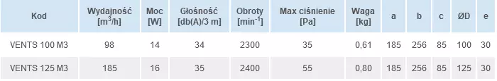 Wentylator Osiowy Vents M3 wykonany z plastiku, domowy, preferowany montaż ścienny lub opcjonalnie sufitowy. Wentylatory wywiewne, zapewniające wysoki poziom komfortu, przeznaczone do wentylacji pomieszczeń mieszkalnych (łazienek, węzłów sanitarnych itp.). Wentylacja o wydajności do 185 m3/h. Przeznaczone do montażu w ciągach wentylacyjnych lub do łączenia z kanałami wentylacyjnymi Ø100, 125 mm.